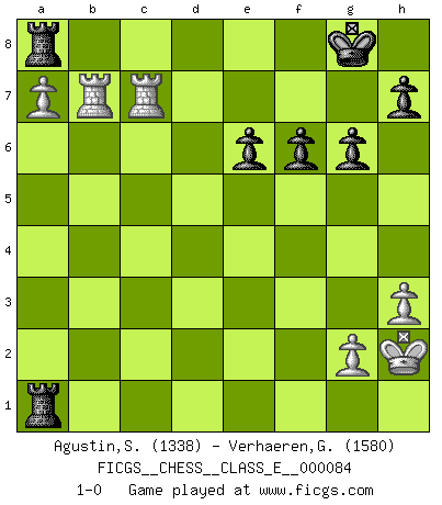 Last move : 1-0 2008 June 18 21:52:25 [Event "FICGS__CHESS__CLASS_E__000084"] [Site "FICGS"] [Date "2008.05.25"] [Round "1"] [White "Agustin,Santos"] [Black "Verhaeren,Gertjan"] [Result "1-0"] [WhiteElo "1338"] [BlackElo "1580"] 1.e4 c5 2.Nc3 Nc6 3.Nf3 g6 4.d4 cxd4 5.Nxd4 Bg7 6.Be3 Nf6 7.Bc4 Qa5 8.O-O O-O 9.Bb3 d6 10.h3 Bd7 11.f4 Qh5 12.a3 Qxd1 13.Raxd1 Rac8 14.e5 dxe5 15.Nxc6 Bxc6 16.fxe5 Ne4 17.Nxe4 Bxe4 18.Rd7 e6 19.Bd4 Bxc2 20.Bxc2 Rxc2 21.Rxb7 Rd2 22.Bc3 Re2 23.Rxa7 Bxe5 24.Bxe5 Rxe5 25.a4 Re2 26.b4 f6 27.a5 Rb2 28.Rc1 Rxb4 29.R1c7 Rh4 30.Rab7 Ra8 31.a6 Ra4 32.a7 Ra1+ 33.Kh2 1-0 Sicilian : Closed, 2...Nc6 Kingside Castling by player White (move 8) Kingside Castling by player Black (move 8) Player White won this chess game. Follow this game move after move (download)When you see a good move, look for a better one. (Emanuel Lasker) Später, ... hatte ich zunehmend Erfolg in entscheidenden Partien. Vielleicht weil ich eine einfache Wahrheit erkannte: nicht nur ich hatte Angst, auch mein Gegner. (Mikhail Nekhemyevich Tal) Tu puedes aprender mucho mas de una partida que pierdas que de una partida ganada. Tendras que perder cientos de partidas antes de llegar a ser un buen jugador. (Jose Raul Capablanca) Avant la finale, les dieux ont créé le milieu de partie. (Tarrasch) Men should grow up. - Yeah. And dogs should stop licking themselves. It's not gonna happen. (Gregory House to Dr. Cameron, House M.D.)