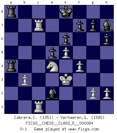 Last move : 0-1 2008 June 29 23:34:33 [Event "FICGS__CHESS__CLASS_E__000084"] [Site "FICGS"] [Date "2008.05.25"] [Round "1"] [White "Cabrera,Claudio"] [Black "Verhaeren,Gertjan"] [Result "0-1"] [WhiteElo "1351"] [BlackElo "1580"] 1.d4 Nf6 2.Bg5 e6 3.e4 h6 4.Bxf6 Qxf6 5.Nf3 d5 6.e5 Qd8 7.Nbd2 c5 8.Bb5+ Nc6 9.c3 Qb6 10.Qb3 cxd4 11.Bxc6+ bxc6 12.Qxb6 axb6 13.Nxd4 c5 14.Nb5 Kd7 15.f4 Ba6 16.Na3 Be7 17.Kf2 Bd3 18.Ke3 Bf5 19.Nf3 Kc6 20.Nb1 Ra4 21.Nbd2 Rha8 22.a3 b5 23.Rac1 Kd7 24.Rhe1 b4 25.axb4 cxb4 26.Nd4 bxc3 27.Rxc3 Bh7 28.Rec1 Bb4 29.Rc7+ Ke8 30.b3 Bxd2+ 0-1 Trompowsky attack (Ruth, Opovcensky Opening) Player Black won this chess game. Follow this game move after move (download)One doesn't have to play well, it's enough to play better than your opponent. (Siegbert Tarrasch) Es war undenkbar für die Behörden, dass ein sowjetischer Großmeister auf diese Art und Weise [Fischer-Taimanov 6:0] verliert, ohne dass es eine politischer Erklärung dafür gäbe. (Mark Taimanov) Me gusta decir que Bobby Fischer fue el mejor jugador que jamás haya existido. Pero lo que hizo de Fischer un genio, fue su habilidad de mezclar una frescura y pragmatismo Americano con ideas Rusas acerca de la estrategia. (Bruce Pandolfini) Ne tendez aucun piège pour le plaisir ! Ne jouez rien dans l'espoir que l'adversaire réagisse de façon stupide ! Prenez toujours pour acquis que l'adversaire va trouver le meilleur coup ! Ne jouez jamais de coup dans l'espoir que l'adversaire ne voie pas la menace ! Chacun de vos coups doit améliorer la position d'une façon ou d'une autre. I've never seen so many men wasted so badly. (Blondie in The Good, The Bad and The Ugly)
