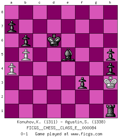 Last move : 0-1 2008 June 30 10:10:48 [Event "FICGS__CHESS__CLASS_E__000084"] [Site "FICGS"] [Date "2008.05.25"] [Round "1"] [White "Konuhov,Konstantin"] [Black "Agustin,Santos"] [Result "0-1"] [WhiteElo "1311"] [BlackElo "1338"] 1.d4 g6 2.e4 d6 3.c4 Bg7 4.Nf3 c5 5.dxc5 Qa5+ 6.Bd2 Qxc5 7.b4 Qb6 8.a3 Bxa1 9.Qa4+ Qc6 10.Qxc6+ Nxc6 11.Bd3 Bg4 12.O-O Bg7 13.h3 Bxf3 14.gxf3 Nf6 15.Nc3 Nh5 16.Nd5 Rc8 17.Rd1 e6 18.Nf4 Ne5 19.Nxh5 gxh5 20.Be3 b6 21.Kf1 Nxd3 22.Rxd3 Ke7 23.Bg5+ f6 24.Bf4 e5 25.Bd2 Rxc4 26.Ke2 Rhc8 27.Kf1 Rd4 28.Rxd4 exd4 29.Ke2 Rc2 30.Kd3 Ra2 31.Bc1 Rxf2 32.Kxd4 Rxf3 33.Kd5 Rd3+ 34.Kc4 Rxh3 35.b5 Rf3 36.Kd4 h4 37.Be3 f5 38.Kd3 f4 39.Ke2 Rxe3+ 40.Kf2 Bd4 41.e5 f3 42.exd6+ Kxd6 43.Kg1 Re1+ 44.Kh2 h5 45.a4 Be5+ 46.Kh3 Rh1+ 0-1 Modern defense Kingside Castling by player White (move 12) Player Black won this chess game. Follow this game move after move (download)The Pawns are the soul of the game. (Francois Andre Danican Philidor) Im Leben werden Partien nie so unstrittig gewonnen wie im Spiel (Emanuel Lasker) Te sientas frente a un tablero y repentinamente tu corazón brinca. Tu mano tiembla al tomar una pieza y moverla. Pero lo que el Ajedrez te enseña es que tu debes permanecer ahí con calma y pensar de que si realmente es una buena idea o de que si hay otras ideas mejores. (Stanley Kubrick) L'ordinateur a tué l'originalité. Il n'y a plus guère d'aventures sur l'échiquier. (Jacob Murray) Life is the sum of all your choices. (Albert Camus)