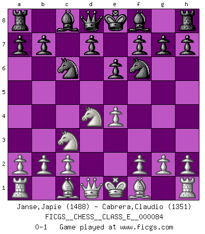 Last move : 0-1 2008 July 11 2:48:29 [Event "FICGS__CHESS__CLASS_E__000084"] [Site "FICGS"] [Date "2008.05.25"] [Round "1"] [White "Janse,Japie"] [Black "Cabrera,Claudio"] [Result "0-1"] [WhiteElo "1488"] [BlackElo "1351"] 1.e4 c5 2.Nf3 Nc6 3.d4 cxd4 4.Nxd4 Nf6 5.Nc3 e6 0-1 This chess game has been lost on time (started : 2008.05.25 22:9:33) Sicilian defense Player Black won this chess game. Follow this game move after move (download)You sit at the board and suddenly your heart leaps. Your hand trembles to pick up the piece and move it. But what Chess teaches you is that you must sit there calmly and think about whether it's really a good idea and whether there are other better ideas. (Stanley Kubrick) Schach ist Krieg, im Schach geht es um testosterongesteuerte Urschreie. (Garry Kasparov) ¿Cual es el objetivo de jugar una apertura de gambito?... Para adquirir una reputación de ser un jugador apuesto a costo de perder el juego. (Siegbert Tarrasch) Ce n'est pas pour s'amuser qu'il joue aux échecs : il célèbre un culte. (Vladimir Nabokov) Shallow men believe in luck. Strong men belive in cause and effect. (Ralph Waldo Emerson)