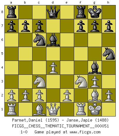 Last move : 1-0 2008 July 13 2:53:55 [Event "FICGS__CHESS__THEMATIC_TOURNAMENT__000051"] [Site "FICGS"] [Date "2008.05.26"] [Round "1"] [White "Parmet,Daniel"] [Black "Janse,Japie"] [Result "1-0"] [WhiteElo "1595"] [BlackElo "1488"] 1.f4 e5 2.fxe5 d5 3.exd6 Bxd6 4.Nf3 Nf6 5.g3 Nh5 6.Bg2 Bg4 7.O-O O-O 8.Nc3 Nc6 9.d4 1-0 This chess game has been lost on time (started : 2008.05.26 7:56:27) Bird : From gambit Kingside Castling by player White (move 7) Kingside Castling by player Black (move 7) Player White won this chess game. Follow this game move after move (download)A passed Pawn increases in strength as the number of pieces on the board diminishes. (Capablanca) Ich bin stolz ein Bulgare zu sein. (Veselin Topalov) Una de estas pequeñas movidas modestas pudieran ser mas molestas a tu oponente que la amenaza mas grande. (Siegbert Tarrasch) Aidez vos pièces, elles vous aideront. (Paul Morphy) Sometimes it pays to stay in bed in Monday, rather than spending the rest of the week debugging Monday's code. (Dan Salomon)