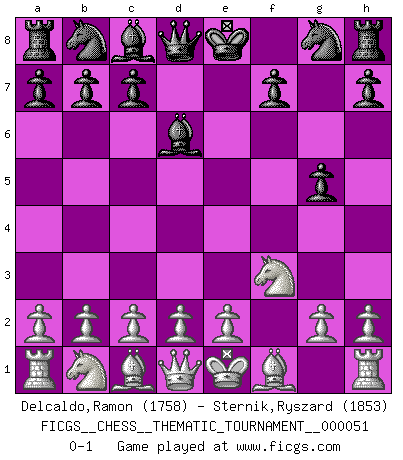 Last move : 0-1 2008 May 28 22:43:55 [Event "FICGS__CHESS__THEMATIC_TOURNAMENT__000051"] [Site "FICGS"] [Date "2008.05.26"] [Round "1"] [White "Delcaldo,Ramon"] [Black "Sternik,Ryszard"] [Result "0-1"] [WhiteElo "1758"] [BlackElo "1853"] 1.f4 e5 2.fxe5 d6 3.Nf3 dxe5 4.Nxe5 Bd6 5.Nf3 g5 0-1 Bird : From gambit Player Black won this chess game. Follow this game move after move (download)After a bad opening, there is hope for the middle game. After a bad middle game, there is hope for the endgame. But once you are in the endgame, the moment of truth has arrived. (Edmar Mednis) Schon mancher Spieler hat aufgegeben, um zu vermeiden, daß er eine Figur verliert. (Savielly Grigorievitsch Tartakower) El Ajedrez se juega con la mente... ¡no con las manos!. (Renaud y Kahn) On peut tirer plus d'utilité d'une partie perdue que de 100 parties gagnées. (Capablanca) Hardware: the parts of a computer that can be kicked. (Jeff Persis)