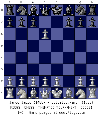 Last move : 1-0 2008 May 31 19:8:1 [Event "FICGS__CHESS__THEMATIC_TOURNAMENT__000051"] [Site "FICGS"] [Date "2008.05.26"] [Round "1"] [White "Janse,Japie"] [Black "Delcaldo,Ramon"] [Result "1-0"] [WhiteElo "1488"] [BlackElo "1758"] 1.f4 e5 2.fxe5 d6 3.exd6 1-0 Bird : From gambit Player White won this chess game. Follow this game move after move (download)In the perfect Chess combination as in a first-rate short story, the whole plot and counter-plot should lead up to a striking finale, the interest not being allayed until the very last moment. (Yates and Winter) Garry Kasparov war erst in der Großmeister-Organisation GMA, dann in der Profischach-Vereinigung PCA, zum Schluss kehrte er wieder in den Schoß der FIDE zurück. Aber gut, manche Leute sind flexibel (Viswanathan Anand) El Ajedrez es un terrible juego. Si no controlas el centro, tu oponente tiene una posición mas holgada. Si tienes control del centro, ¡entonces realmente tu tienes algo de que preocuparte!. (Siegbert Tarrasch) Il a essayé de se convaincre qu'il pourrait empêcher toutes les erreurs et ne jamais perdre. L'horreur ! Gary Kasparov au sujet de Robert Fischer. The age of a woman doesn't mean a thing. The best tunes are played on the oldest fiddles. (Ralph Waldo Emerson)