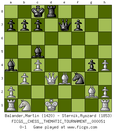 Last move : 0-1 2008 August 23 7:4:39 [Event "FICGS__CHESS__THEMATIC_TOURNAMENT__000051"] [Site "FICGS"] [Date "2008.05.26"] [Round "1"] [White "Balander,Martin"] [Black "Sternik,Ryszard"] [Result "0-1"] [WhiteElo "1420"] [BlackElo "1853"] 1.f4 e5 2.fxe5 d6 3.exd6 Bxd6 4.Nf3 g5 5.g3 g4 6.Nh4 Ne7 7.d4 Ng6 8.Ng2 Nc6 9.c3 h5 10.e4 h4 11.e5 Ncxe5 12.dxe5 Nxe5 13.Nxh4 Rxh4 14.gxh4 Nf3+ 15.Ke2 Qe7+ 16.Be3 Bd7 17.Qd3 O-O-O 18.Bg2 Bc5 19.c4 Nd4+ 20.Kd1 Ba4+ 21.b3 Nf3 0-1 Bird : From gambit, Lasker variation Queenside Castling by player Black (move 17) Player Black won this chess game. Follow this game move after move (download)I don't believe in psychology. I believe in good moves. (Bobby Fischer) Glücklicherweise sind Großmeister Ruben Fines reine Schachbücher weniger phallozentrisch [als seine Schachpsychologie] und deswegen auch weniger lächerlich. (Nigel Short) Coloca el contenido de las piezas del Ajedrez en un sombrero, agitalo vigorosamente, arrojalas en un tablero desde una altura de 30 centimetros y así obtendras el estilo de Steinitz. (H. E. Bird) Seul un grand joueur sait à quel point il joue faiblement. (Xavier Tartacover) There are more things in heaven and earth than practically anywhere else. (Unknown)