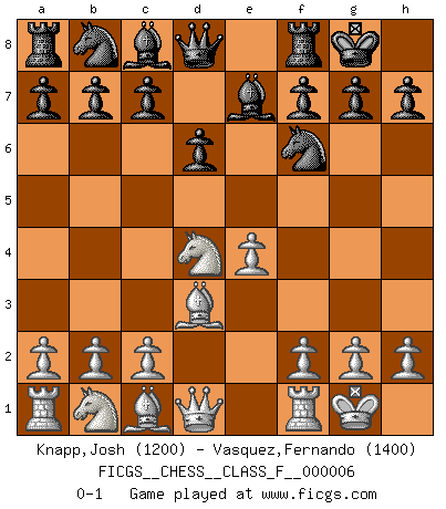Last move : 0-1 2006 September 7 1:27:26 [Event "FICGS__CHESS__CLASS_F__000006"] [Site "FICGS"] [Date "2006.07.19"] [Round "1"] [White "Carlo,John"] [Black "Vasquez,Fernando"] [Result "0-1"] [WhiteElo "1200"] [BlackElo "1400"] 1.e4 e5 2.Nf3 d6 3.d4 exd4 4.Nxd4 Nf6 5.Bd3 Be7 6.O-O O-O 0-1 This chess game has been lost on time (started : 2006.07.19 22:49:45) Philidor : Exchange variation Kingside Castling by player White (move 6) Kingside Castling by player Black (move 6) Player Black won this chess game. Follow this game move after move (download)For surely of all the drugs in the world, Chess must be the most permanently pleasurable. (Assiac) Ein Schachspiel besteht aus drei Phasen: Die erste, wenn du hofftst den Vorteil zu haben, die zweite, wenn du glaubst einen Vorteil zu haben, und die dritte.... wenn du weißt Du wirst verlieren. (Savielly Grigorievitsch Tartakower) Tu puedes aprender mucho mas de una partida que pierdas que de una partida ganada. Tendras que perder cientos de partidas antes de llegar a ser un buen jugador. (Jose Raul Capablanca) Les erreurs sont comme les malheurs, elles n'arrivent jamais seules. (Siegbert Tarrasch) If you have any trouble condescending, find a Unix user to show you how it's done. (Scott Adams)