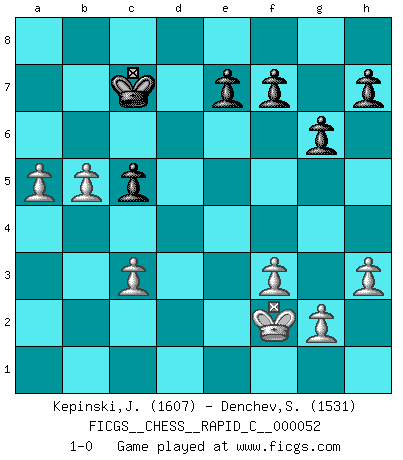 Last move : 1-0 2008 August 4 9:29:24 [Event "FICGS__CHESS__RAPID_C__000052"] [Site "FICGS"] [Date "2008.05.26"] [Round "1"] [White "Kepinski,Janusz"] [Black "Denchev,Stanimir"] [Result "1-0"] [WhiteElo "1607"] [BlackElo "1531"] 1.e4 c5 2.Bc4 Nf6 3.Nc3 Nc6 4.Nf3 d6 5.d3 g6 6.O-O Bg7 7.h3 Bd7 8.Be3 O-O 9.Re1 Na5 10.b3 a6 11.e5 dxe5 12.Nxe5 Nxc4 13.dxc4 Ne4 14.Nxd7 Bxc3 15.Nxf8 Bxe1 16.Qxe1 Qxf8 17.f3 Nd6 18.Bxc5 Rd8 19.Bxd6 Rxd6 20.Rd1 Qd8 21.Rxd6 Qxd6 22.c3 Qc5+ 23.Qf2 b6 24.Qxc5 bxc5 25.b4 Kf8 26.b5 axb5 27.cxb5 Ke8 28.a4 Kd7 29.a5 Kc7 30.Kf2 1-0 Sicilian defense Kingside Castling by player White (move 6) Kingside Castling by player Black (move 8) Player White won this chess game. Follow this game move after move (download)You are for me the Queen on d8 and I am the Pawn on d7 !! (Eduard Gufeld) Ich hatte Zahnschmerzen im ersten Spiel. In der zweiten Partie tat mir der Kopf weh. In der dritten war es eine Rheuma-Attacke und während der vierten fühlte ich mich nicht gut. Und in der fünften? Nun, man muss doch nicht jedes Spiel gewinnen, oder? (Savielly Grigorievitsch Tartakower) La vida es como el Ajedrez, con lucha, competición y eventos buenos y malos. (Benjamin Franklin) Fischer est le meilleur joueur du monde et Karpov n'est qu'un joueur de bistrot. (Garry Kasparov, agé de 16 ans) Real knowledge is to know the extent of one's ignorance. (Confucius)
