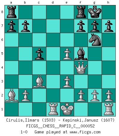 Last move : 1-0 2008 July 21 19:23:54 [Event "FICGS__CHESS__RAPID_C__000052"] [Site "FICGS"] [Date "2008.05.26"] [Round "1"] [White "Cirulis,Ilmars"] [Black "Kepinski,Janusz"] [Result "1-0"] [WhiteElo "1503"] [BlackElo "1607"] 1.d4 d5 2.c4 Nc6 3.cxd5 Qxd5 4.Nf3 e5 5.Nc3 Bb4 6.Bd2 Bxc3 7.Bxc3 e4 8.Ne5 Nxe5 9.dxe5 Ne7 10.e3 c6 11.Qa4 O-O 12.Rd1 Qe6 13.Qxe4 Qxa2 14.Bc4 Bf5 15.Qd4 c5 16.Qf4 Ng6 17.Bxa2 1-0 QGD : Chigorin defense Kingside Castling by player Black (move 11) Player White won this chess game. Follow this game move after move (download)Chess mastery essentially consists of analyzing Chess positions accurately. (Mikhail Botvinnik) Man kann eine Schachpartie nur gewinnen, wenn das Gleichgewicht gestört ist. In einer Stellung mit ungestörtem Gleichgewicht ist auch das größte Genie hilflos - in der Stellung steckt dann eben kein genialer Einfall. (Wilhelm Steinitz) La batalla por la última verdad nunca sera ganada. Y es por eso que el Ajedrez es tan fascinante. (Hans Kmoch) La vie est comme un jeu d'échecs : nous esquissons un plan, mais celui-ci est tributaire de ce que daignent faire l'adversaire aux échecs et le destin dans la vie. (Arthur Schopenhauer) A belief is an idea the mind possesses, an idea that possesses the mind. (Robert Oxden Bolton)