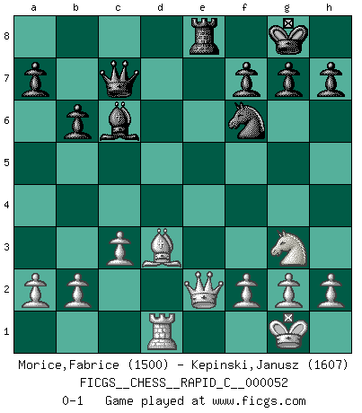 Last move : 0-1 2008 August 16 18:9:13 [Event "FICGS__CHESS__RAPID_C__000052"] [Site "FICGS"] [Date "2008.05.26"] [Round "1"] [White "Morice,Fabrice"] [Black "Kepinski,Janusz"] [Result "0-1"] [WhiteElo "1500"] [BlackElo "1607"] 1.e4 e6 2.d4 d5 3.exd5 exd5 4.Bd3 Bd6 5.Ne2 Ne7 6.O-O O-O 7.Nbc3 Re8 8.Re1 c5 9.dxc5 Bxc5 10.Bg5 b6 11.Bxe7 Rxe7 12.Qd2 Bb7 13.Ng3 Bc6 14.Rxe7 Bxe7 15.Re1 Bg5 16.Qe2 Bf6 17.Nxd5 Nd7 18.Nxf6+ Nxf6 19.Rd1 Qc7 20.c3 Re8 0-1 This chess game has been lost on time (started : 2008.05.26 10:20:14) French : Exchange variation Kingside Castling by player White (move 6) Kingside Castling by player Black (move 6) Player Black won this chess game. Follow this game move after move (download)Before the endgame, the Gods have placed the middle game. (Siegbert Tarrasch) Bobby Fischer ist kein Vorbild für die heutige Jugend. (Viktor Kortschnoi) El Ajedrez demanda una total concentración. (Bobby Fischer) Tout change constamment, y compris dans le monde des Echecs. (Botvinnik) Pretend inferiority and encourage his arrogance. (Sun Tzu)