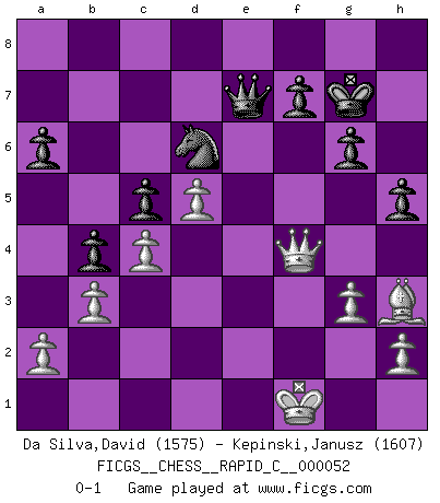 Last move : 0-1 2008 September 5 8:46:46 [Event "FICGS__CHESS__RAPID_C__000052"] [Site "FICGS"] [Date "2008.05.26"] [Round "1"] [White "Da Silva,David"] [Black "Kepinski,Janusz"] [Result "0-1"] [WhiteElo "1575"] [BlackElo "1607"] 1.c4 g6 2.Nc3 Bg7 3.Nf3 Nf6 4.g3 O-O 5.Bg2 d6 6.O-O c5 7.d4 Nc6 8.d5 Na5 9.Nd2 a6 10.Qc2 Rb8 11.b3 b5 12.Bb2 Bd7 13.Rab1 b4 14.Nce4 Rb6 15.Nxf6+ exf6 16.e4 Qe7 17.f4 h5 18.Nf3 Re8 19.Rbe1 Nb7 20.e5 fxe5 21.fxe5 dxe5 22.Bxe5 Bxe5 23.Nxe5 Rf6 24.Nxd7 Rxf1+ 25.Rxf1 Qxd7 26.Qf2 Qc7 27.Qf6 Nd6 28.Qf4 Re2 29.Rf2 Re1+ 30.Rf1 Rxf1+ 31.Kxf1 Kg7 32.Bh3 Qe7 0-1 This chess game has been lost on time (started : 2008.05.26 10:20:14) English Opening Kingside Castling by player Black (move 4) Kingside Castling by player White (move 6) Player Black won this chess game. Follow this game move after move (download)Chess is really ninety nine percent calculation. (Soltis) Habe Mut, dich deines eigenen Verstandes zu bedienen. (Immanuel Kant) Antes de los Finales, los dioses han colocado el Juego Medio. (Siegbert Tarrasch) Que feriez-vous si vous étiez en train de jouer aux échecs et que la fin du monde arrive ? Je continuerais à jouer. (Saint Borromée) It's only after you lost everything, Tyler says, that you're free to do anything. (Chuck Palahniuk, Fight Club)