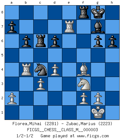 Last move : 1/2-1/2 2006 July 15 17:57:10 [Event "FICGS__CHESS__CLASS_M__000003"] [Site "FICGS"] [Date "2006.04.15"] [Round "1"] [White "Florea,Mihai"] [Black "Zubac,Marius"] [Result "1/2-1/2"] [WhiteElo "2281"] [BlackElo "2223"] 1.e4 c5 2.Nf3 Nc6 3.Bb5 g6 4.O-O Bg7 5.c3 Nf6 6.Re1 O-O 7.e5 Nd5 8.d4 cxd4 9.cxd4 d6 10.Nc3 Nxc3 11.bxc3 Qc7 12.exd6 exd6 13.Bf4 Bf5 14.Bd3 Bxd3 15.Qxd3 Na5 16.Qb5 Nc4 17.Rab1 b6 18.Qd5 Rac8 19.h4 h6 20.Rb4 Rfd8 21.h5 Qc6 22.Qxc6 Rxc6 23.hxg6 fxg6 24.Re7 Rf8 1/2-1/2 Sicilian : Nimzovich-Rossolimo attack (with ...g6, without ...d6) Kingside Castling by player White (move 4) Kingside Castling by player Black (move 6) This chess game ended in a draw. Follow this game move after move (download)First-class players lose to second class players because second-class players sometimes play a first-class game. (Tarrasch) Ich verachte Kasparow. (Viktor Kortschnoi) Con o sin el título, Bobby Fischer fue sin lugar a dudas el mas grande jugador de su época. (Burt Hochberg) Shah mat. Le roi est mort. Cri de fierté d'un joueur venant de terrasser son adversaire, courtoisement, sans effusion de sang. I think your argument is specious - I think your tie is ugly. (Gregory House to Dr. Foreman, House M.D.)