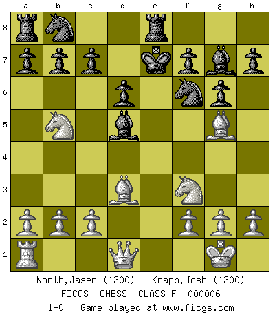 Last move : 1-0 2006 October 9 23:48:23 [Event "FICGS__CHESS__CLASS_F__000006"] [Site "FICGS"] [Date "2006.07.19"] [Round "1"] [White "North,Jasen"] [Black "Carlo,John"] [Result "1-0"] [WhiteElo "1200"] [BlackElo "1200"] 1.e4 e5 2.Nf3 Nf6 3.Nxe5 Qe7 4.d4 Nxe4 5.Bd3 Nf6 6.O-O d6 7.Nf3 g6 8.Bg5 Bg7 9.Re1 Be6 10.d5 Bxd5 11.Rxe7+ Kxe7 12.Nc3 Re8 13.Nb5 1-0 Petrov's defense Kingside Castling by player White (move 6) Player White won this chess game. Follow this game move after move (download)The most powerful weapon in Chess is to have the next move. (David Bronstein) Es tut gut, die Entwicklungsperiode von, [...] demokratischem Geist durchdringen zu lassen. Wie undemokratisch wäre es doch beispielsweise, den einen Offizier große Spaziertouren vornehmen zu lassen, während die anderen zu Hause säßen und sich entsetzlich langweilten. (Aaron Nimzowitsch) Dejen al perfeccionista jugar por correo. (Yasser Seirawan) Que feriez-vous si vous étiez en train de jouer aux échecs et que la fin du monde arrive ? Je continuerais à jouer. (Saint Borromée) He who laughs last probably does not get the joke. (Unknown)