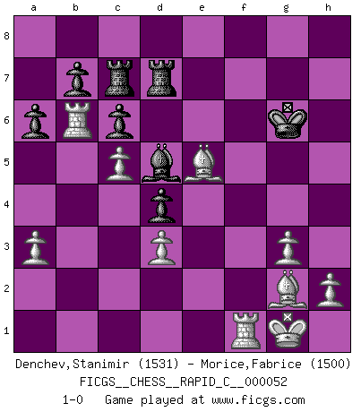 Last move : 1-0 2008 August 24 19:13:9 [Event "FICGS__CHESS__RAPID_C__000052"] [Site "FICGS"] [Date "2008.05.26"] [Round "1"] [White "Denchev,Stanimir"] [Black "Morice,Fabrice"] [Result "1-0"] [WhiteElo "1531"] [BlackElo "1500"] 1.c4 e5 2.d3 Nf6 3.g3 d5 4.cxd5 Nxd5 5.Bg2 Be6 6.Nc3 Bb4 7.Bd2 Nxc3 8.bxc3 Bd5 9.e4 Be6 10.cxb4 a6 11.Qc2 O-O 12.Ne2 Nc6 13.O-O Rc8 14.a3 Qd6 15.Be3 Rfd8 16.Rad1 Nd4 17.Nxd4 exd4 18.Bf4 Qe7 19.Qc5 Qxc5 20.bxc5 c6 21.Rb1 Rd7 22.Rb6 f6 23.Rfb1 g5 24.Bd2 R8c7 25.f4 h6 26.e5 Kg7 27.exf6+ Kxf6 28.fxg5+ hxg5 29.Rf1+ Kg7 30.Bxg5 Bd5 31.Bf6+ Kg6 32.Be5 1-0 This chess game has been lost on time (started : 2008.05.26 10:20:14) English Opening Kingside Castling by player Black (move 11) Kingside Castling by player White (move 13) Player White won this chess game. Follow this game move after move (download)The Chess pieces are the block alphabet which shapes thoughts; and these thoughts, although making a visual design on the chessboard, express their beauty abstractly, like a poem. (Marcel Duchamp) Mein Gehirn das ist mein zweitwichtigstes Organ [Aus dem Film: Der Schläfer]. (Woody Allen) Preferería tener un Peón que un dedo. (Reuben Fine) Karpov est une pièce de musée. (Garry Kasparov) Bobby never cared about money, though. His only desire was to prove that his choices were correct: He wanted chess to be important because he was a chess player, and he wanted to be important. Bobby knew money was important, but he didn't have a clue why, outside of clothes and status. The only way he could accomplish what he wanted was to fight for a lot of money. Once he got it, he gave it away. He did not know how to spend it. And once he'd become champion, after, essentially, sacrificing his life for it, he didn't know how to spend his time. (Bob Wade)
