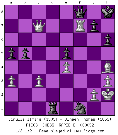Last move : 1/2-1/2 2008 August 24 23:7:12 [Event "FICGS__CHESS__RAPID_C__000052"] [Site "FICGS"] [Date "2008.05.26"] [Round "1"] [White "Cirulis,Ilmars"] [Black "Dineen,Thomas"] [Result "1/2-1/2"] [WhiteElo "1503"] [BlackElo "1655"] 1.d4 Nf6 2.c4 e6 3.Nc3 Bb4 4.a3 Bxc3+ 5.bxc3 b6 6.f3 O-O 7.e4 d6 8.Bd3 e5 9.Ne2 Ba6 10.O-O Nc6 11.f4 Qd7 12.fxe5 dxe5 13.Bg5 Ne8 14.Qa4 h6 15.Bh4 Nd6 16.Ng3 Qe8 17.Nf5 Na5 18.Qd1 Nxf5 19.Rxf5 f6 20.dxe5 fxe5 21.Qg4 Bxc4 22.Rd1 Kh7 23.Rxf8 Qxf8 24.Bxc4 Nxc4 25.Rd7 c6 26.h3 b5 27.Re7 a5 28.Qd7 Kh8 29.Qxc6 Rd8 30.Qc7 Ne3 31.Rf7 Rd1+ 32.Kh2 Nf1+ 1/2-1/2 Nimzo-Indian : Saemisch variation Kingside Castling by player Black (move 6) Kingside Castling by player White (move 10) This chess game ended in a draw. Follow this game move after move (download)Is Bobby Fischer quite sane ? (Salo Flohr) Schach ist gnadenlos. Du mußt bereit sein zu töten. (Nigel Short) Un jugador que es sorprendido, esta derrotado a medias. (Proverbio) Même si l'adversaire joue le coup analysé précédemment, recommencez l'analyse en voyant la nouvelle position. Première règle de Blumenfeld All maxims have their antagonist maxims; proverbs should be sold in pairs, a single one being but a half truth. (William Mathews)