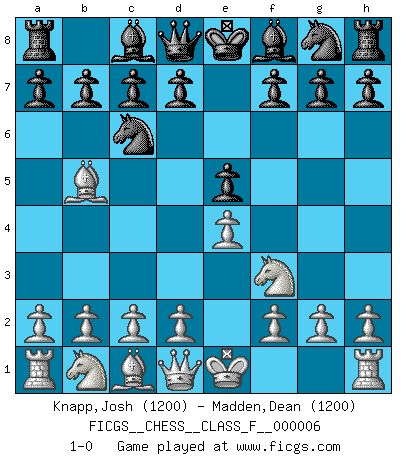 Last move : 1-0 2006 September 12 6:35:19 [Event "FICGS__CHESS__CLASS_F__000006"] [Site "FICGS"] [Date "2006.07.19"] [Round "1"] [White "Carlo,John"] [Black "Madden,Dean"] [Result "1-0"] [WhiteElo "1200"] [BlackElo "1200"] 1.e4 e5 2.Nf3 Nc6 3.Bb5 1-0 This chess game has been lost on time (started : 2006.07.19 22:49:45) Ruy Lopez (Spanish Opening) Player White won this chess game. Follow this game move after move (download)For me, Chess is life and every game is like a new life. Every Chess player gets to live many lives in one lifetime. (Eduard Gufeld) Spielt Blackmar-Diemer-Gambit, und das Matt kommt von selbst! (Emil Joseph Diemer) Me gusta decir que Bobby Fischer fue el mejor jugador que jamás haya existido. Pero lo que hizo de Fischer un genio, fue su habilidad de mezclar una frescura y pragmatismo Americano con ideas Rusas acerca de la estrategia. (Bruce Pandolfini) Les écrivains ont utilisé les échecs pour analyser les côtés extrêmes de la nature humaine. Dans ce cadre, les échecs offrent un champ d'expérimentation idéal. Mais on pourrait faire la même chose avec la peinture. Et là, en vous référant à Van Gogh, vous ne tirerez pas de conclusion définitive sur les peintres. (Gary Kasparov) Life is like a play: it's not the length but the excellence of the acting that matters. (Seneca)
