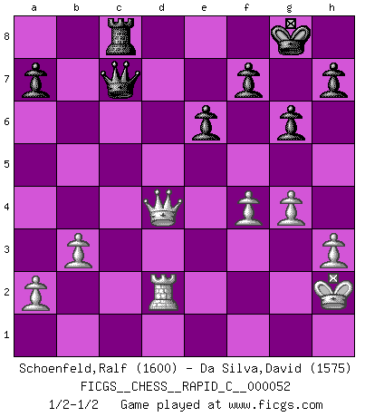 Last move : 1/2-1/2 2008 June 1 23:11:48 [Event "FICGS__CHESS__RAPID_C__000052"] [Site "FICGS"] [Date "2008.05.26"] [Round "1"] [White "Schoenfeld,Ralf"] [Black "Da Silva,David"] [Result "1/2-1/2"] [WhiteElo "1600"] [BlackElo "1575"] 1.e4 c6 2.Bc4 d5 3.exd5 cxd5 4.Bb3 Nf6 5.d4 Nc6 6.Nf3 Bg4 7.c3 e6 8.h3 Bh5 9.g4 Bg6 10.Bg5 Be7 11.Ne5 Nxe5 12.dxe5 Ne4 13.Bxe7 Qxe7 14.Nd2 Qg5 15.Nxe4 Bxe4 16.O-O O-O 17.Qd4 Qf4 18.Qe3 Qxe5 19.f4 Qc7 20.Rac1 b5 21.c4 bxc4 22.Bxc4 dxc4 23.Qxe4 Rac8 24.b3 c3 25.Rf2 Rfd8 26.Rfc2 Qc5+ 27.Kh1 Rd2 28.Rxc3 Rd1+ 29.Rxd1 Qxc3 30.Qd3 Qc6+ 31.Kh2 g6 32.Rd2 Qc7 33.Qd4 Qc1 34.Qf2 Qc7 35.Qd4 1/2-1/2 Caro-Kann : Hillbilly attack Kingside Castling by player White (move 16) Kingside Castling by player Black (move 16) This chess game ended in a draw. Follow this game move after move (download)It is difficult to play against Einstein's theory --on his first loss to Fischer. (Mikhail Tal) Es ist nicht das erste mal, dass sich die FIDE dem Arabischen Geld gebeugt hat (über die FIDE WM 2004 in Lybien). (Larry Evans) Repentinamente, me resultaba obvio en mi analisis que yo había pasado por alto lo que Fischer había visto en el tablero con la mas grande facilidad. (Mikhail Botvinnik) Les Echecs ne sont pas pour les âmes timides. Ils requièrent un homme entier, qui ne s'arrête pas aveuglément à ce qui a été déjà établi, mais qui tente individuellement de sonder les profondeurs du jeu. (W. Steinitz) It is not enough to be a good player... you must also play well. (Siegbert Tarrasch)