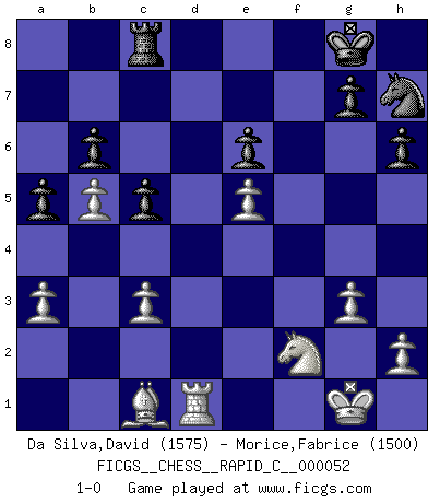 Last move : 1-0 2008 June 24 18:14:33 [Event "FICGS__CHESS__RAPID_C__000052"] [Site "FICGS"] [Date "2008.05.26"] [Round "1"] [White "Da Silva,David"] [Black "Morice,Fabrice"] [Result "1-0"] [WhiteElo "1575"] [BlackElo "1500"] 1.c4 e5 2.Nc3 Nf6 3.Nf3 Nc6 4.g3 b6 5.Bg2 Bb4 6.O-O O-O 7.Nxe5 Bb7 8.Nd3 Bxc3 9.dxc3 h6 10.b4 a6 11.e4 d6 12.Re1 Re8 13.f4 Na7 14.Nf2 c5 15.Bb2 Nc6 16.Qd2 Qe7 17.Rad1 Rad8 18.a3 a5 19.b5 Na7 20.Qc2 Nc8 21.Bc1 Qe6 22.e5 dxe5 23.Bxb7 Rxd1 24.Qxd1 Qxc4 25.fxe5 Nh7 26.Qd7 Qe6 27.Qxe6 fxe6 28.Bxc8 Rxc8 29.Rd1 1-0 English Opening Kingside Castling by player White (move 6) Kingside Castling by player Black (move 6) Player White won this chess game. Follow this game move after move (download)Look at Garry Kasparov. After he loses, invariably he wins the next game. He just kills the next guy. That's something that we have to learn to be able to do. (Maurice Ashley) Über Kasparov: Es ist offensichtlich, daß er in einem totalitären Staat aufwuchs und deshalb zu diktatorischen Zügen neigt. (Viktor Kortschnoi) Siempre es mucho mejor sacrificar las piezas de tu oponente. (Savielly Tartakover) C'est une question de caractère, Beaucoup de gens perdent leur motivation très vite. D'autres, ils sont rares, peuvent la conserver très longtemps. J'aime les échecs, encore aujourd'hui je suis heureux d'analyser des parties. J'aime toujours gagner, je déteste encore perdre. Bien jouer est important pour mon intégrité intellectuelle et morale. Et puis les échecs vivent en ce moment une période historique grâce à Internet. Ils se développent dans les systèmes éducatifs à travers le monde. Ils sortent de leur ghetto, et c'est mon rôle de mener à bien cette révolution. (Gary Kasparov) Lamb in skin of tiger, still fears the wolf. (Chinese proverb)