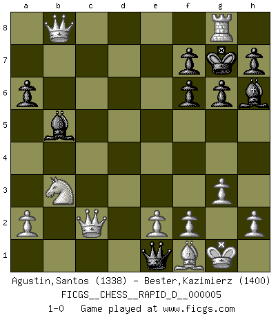 Last move : 1-0 2008 July 4 9:48:29 [Event "FICGS__CHESS__RAPID_D__000005"] [Site "FICGS"] [Date "2008.05.26"] [Round "1"] [White "Agustin,Santos"] [Black "Bester,Kazimierz"] [Result "1-0"] [WhiteElo "1338"] [BlackElo "1400"] 1.c4 c5 2.g3 d6 3.Nc3 g6 4.Nf3 Bg7 5.Bg2 Nf6 6.d4 Nbd7 7.O-O O-O 8.b3 a6 9.Rb1 Rb8 10.Qc2 Qc7 11.Rd1 cxd4 12.Nxd4 Ne5 13.Bg5 Bd7 14.Bxf6 exf6 15.Nd5 Qd8 16.c5 Rc8 17.b4 dxc5 18.bxc5 Qa5 19.Ne7+ Kh8 20.Nxc8 Rxc8 21.Rxb7 Bh6 22.c6 Be8 23.Nb3 Qa4 24.c7 Nd7 25.Rd4 Qa3 26.Rb8 Nxb8 27.Rd8 Qb4 28.Rxc8 Qe1+ 29.Bf1 Kg7 30.cxb8Q Bb5 31.Rg8+ 1-0 English : Symmetrical variation Kingside Castling by player White (move 7) Kingside Castling by player Black (move 7) Promotion Queen by player White (move 30) Player White won this chess game. Follow this game move after move (download)Chess is a foolish expedient for making idle people believe they are doing something very clever when they are only wasting their time. (George Bernard Shaw) Mutter, ich bin eben Ex-Weltmeister geworden. --beim nach Hause Kommen nach dem Verlust des WM-Titels an Mihail Botvinnik -- (Mikhail Nekhemyevich Tal) No puedes jugar al Ajedrez si eres de corazón noble. (Proverbio Francés) Roi des jeux et jeu des rois, les échecs portent en eux un sentiment d'infini. Ils donnent à celui qui s'est efforcé d'en approfondir les arcanes l'impression de n'être pas à la mesure de l'homme; en fait, ils constituent un résumé de l'univers, un microcosme, et figurent cette grande échelle qui, dans les plans de la lumière descend jusqu'à la matière, qui des abîmes insondables remonte jusqu'en l'infini de Dieu. (Pyrame) We cannot be sure of having something to live for unless we are willing to die for it. (Ernesto Che Guevara)