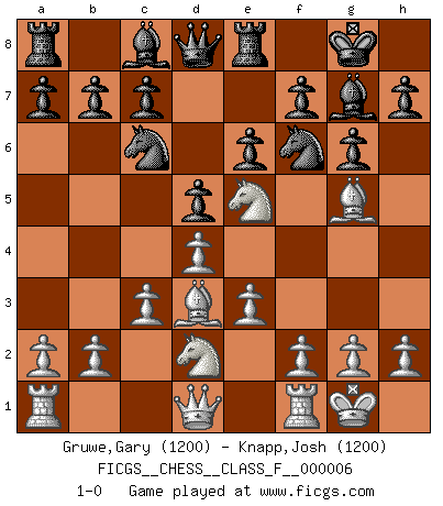 Last move : 1-0 2006 September 26 21:24:12 [Event "FICGS__CHESS__CLASS_F__000006"] [Site "FICGS"] [Date "2006.07.19"] [Round "1"] [White "Gruwe,Gary"] [Black "Carlo,John"] [Result "1-0"] [WhiteElo "1200"] [BlackElo "1200"] 1.d4 d5 2.Nf3 Nc6 3.c3 g6 4.Bg5 Bg7 5.e3 Nf6 6.Nbd2 O-O 7.Bd3 e6 8.O-O Re8 9.Ne5 1-0 This chess game has been lost on time (started : 2006.07.19 22:49:45) Queen's pawn game, Chigorin variation Kingside Castling by player Black (move 6) Kingside Castling by player White (move 8) Player White won this chess game. Follow this game move after move (download)Castle early and often. (Rob Sillars) Der Schachmeister von Heute braucht Courage, einen Killerinstinkt, Ausdauer und Arroganz. (Larry Evans) De todos mis libros Rusos, la defensa contiene y difunde el 'calor' mas grande que pudiese verse extraño al observar lo supremamente abstracto que el Ajedrez supuestamente es. (Vladimir Nabokov) Il a essayé de se convaincre qu'il pourrait empêcher toutes les erreurs et ne jamais perdre. L'horreur ! Gary Kasparov au sujet de Robert Fischer. You think that education is too expensive ? Try ignorance. (Derek Bok)