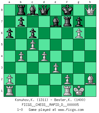 Last move : 1-0 2008 August 6 5:2:49 [Event "FICGS__CHESS__RAPID_D__000005"] [Site "FICGS"] [Date "2008.05.26"] [Round "1"] [White "Konuhov,Konstantin"] [Black "Bester,Kazimierz"] [Result "1-0"] [WhiteElo "1311"] [BlackElo "1400"] 1.d4 e6 2.c4 Nf6 3.Nf3 Be7 4.Bf4 O-O 5.e3 d6 6.Bd3 Nbd7 7.O-O Rb8 8.h3 a6 9.Nc3 c6 10.b4 Nh5 11.Bh2 f5 12.c5 d5 13.g4 fxg4 14.hxg4 Nhf6 15.Ng5 Qe8 16.Nxe6 Rf7 17.g5 Ne4 18.Nxe4 dxe4 19.Bxe4 Nf8 20.Nxf8 Qxf8 21.Bxh7+ Kxh7 22.Qh5+ Kg8 23.g6 Qd8 24.Qh7+ Kf8 25.Qh8+ 1-0 This chess game has been lost on time (started : 2008.05.26 17:45:10) Queen's pawn Kingside Castling by player Black (move 4) Kingside Castling by player White (move 7) Player White won this chess game. Follow this game move after move (download)I feel as if I were a piece in a game of Chess, when my opponent says of it: That piece cannot be moved. (Soren Kierkegaard) Schach ist das schnellste Spiel der Welt, weil man in jeder Sekunde Tausende von Gedanken ordnen muß. (Albert Einstein) Un jugador que trata de regresar una movida en el Ajedrez es un futuro carterista. (Richard Fenton) Pour moi, les échecs ne sont pas un jeu mais un art. (Alexandre Alekhine) I take risks, sometimes patients die, but not taking risks causes more patients to die. So I guess my biggest problem is I've been cursed with the ability to do the math. (Gregory House, House M.D.)
