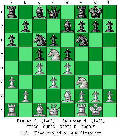 Last move : 1-0 2008 July 9 2:45:26 [Event "FICGS__CHESS__RAPID_D__000005"] [Site "FICGS"] [Date "2008.05.26"] [Round "1"] [White "Bester,Kazimierz"] [Black "Balander,Martin"] [Result "1-0"] [WhiteElo "1400"] [BlackElo "1420"] 1.e4 c5 2.c4 Nc6 3.Nf3 e5 4.Nc3 Nf6 5.Be2 Be7 6.d3 d6 7.O-O O-O 8.a3 a6 9.Nd5 1-0 This chess game has been lost on time (started : 2008.05.26 17:45:10) Sicilian defense Kingside Castling by player White (move 7) Kingside Castling by player Black (move 7) Player White won this chess game. Follow this game move after move (download)A thorough understanding of the typical mating continuations makes the most complicated sacrificial combinations leading up to them not only not difficult, but almost a matter of course. (Siegbert Tarrasch) Es ist besser die Steine des Gegners zu opfern. (Savielly Grigorievitsch Tartakower) Aún el Rey más flojo huye despavorido ante la amenaza de un Jaque doble. (Aaron Nimzowitsch) Les Echecs représentent une sphère d'idées créatrices basée sur la volonté des deux protagonistes. (Smyslov) The faster the computer, the slower the brain. (Thibault de Vassal)