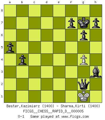 Last move : 0-1 2008 September 21 22:14:50 [Event "FICGS__CHESS__RAPID_D__000005"] [Site "FICGS"] [Date "2008.05.26"] [Round "1"] [White "Bester,Kazimierz"] [Black "Sharma,Kirti"] [Result "0-1"] [WhiteElo "1400"] [BlackElo "1400"] 1.e4 e5 2.Nf3 Nc6 3.d4 exd4 4.Nxd4 Nf6 5.Bb5 Nxd4 6.Qxd4 c6 7.Bc4 d6 8.O-O Be7 9.Be3 O-O 10.Nc3 Be6 11.Rad1 Ng4 12.Be2 Nxe3 13.fxe3 Qc7 14.Bf3 Rfd8 15.Qd3 Bg5 16.a4 Qb6 17.Rfe1 Rd7 18.b3 Rad8 19.Kh1 Qc5 20.h3 a5 21.Na2 b5 22.axb5 cxb5 23.Nc3 b4 24.Nd5 Rc8 25.Qd4 Qxc2 26.Nb6 Bf6 27.Nxd7 Bxd4 28.exd4 Bxd7 29.e5 Qxb3 30.d5 dxe5 31.Rxe5 Bxh3 32.d6 Be6 33.d7 Rd8 34.Bg4 g6 35.R5e1 Bxg4 36.Re8+ Kg7 37.Rd2 Rxd7 38.Rxd7 Bxd7 39.Re7 Qd1+ 40.Kh2 Qd6+ 41.Re5 Qxe5+ 42.g3 Qe2+ 43.Kg1 Bh3 44.g4 Qg2+ 0-1 This chess game has been lost on time (started : 2008.05.26 17:45:10) Scotch : Schmidt variation Kingside Castling by player White (move 8) Kingside Castling by player Black (move 9) 10 pieces endgame at move 41 : White KP , Black KQBPPPPP WHITE : King + 1 Pawn BLACK : King + 1 Queen 1 Bishop 5 Pawns Player Black won this chess game. Follow this game move after move (download)It is the aim of the modern school, not to treat every position according to one general law, but according to the principle inherent in the position. (Richard Reti) Ich möchte Schüler heranbilden, die das Vermögen haben, selbst zu denken und Kritik zu üben. (Emanuel Lasker) Ciertamente, de todas la drogas del mundo, el Ajedrez debe ser el mas placentero permamentemente. (Assiac) Il (Jacob Murray) ne joue pas pour le bon coup, mais pour le meilleur. (Eloi Relange) I don't know, I don't care, and it doesn't make any difference. (Albert Einstein)