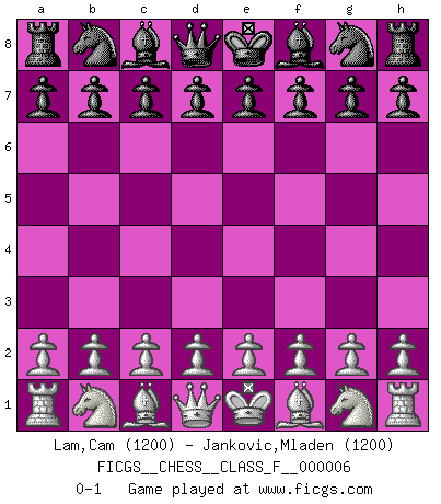 Last move : 0-1 2006 August 29 6:53:13 [Event "FICGS__CHESS__CLASS_F__000006"] [Site "FICGS"] [Date "2006.07.19"] [Round "1"] [White "Lam,Cam"] [Black "Jankovic,Mladen"] [Result "0-1"] [WhiteElo "1200"] [BlackElo "1200"] 0-1 This chess game has been lost on time (started : 2006.07.19 22:49:45) Player Black won this chess game. Follow this game move after move (download)Fischer is completely natural. He plays no roles. He's like a child. Very, very simple. (Zita Rajcsanyi) Im Schach gewinnt jeder. Hat man Freunde am Spiel - und das ist die Hauptsache - ist auch der Verlust einer Partie kein Unglück. (David Bronstein) Mis oponentes también hacen buenas movidas. A veces yo no tomo esas cosas en consideración. (Bobby Fischer) Toutes les manuvres exécutées sur une colonne ouverte ont pour but ultime l'intrusion définitive sur la septième ou la huitième rangée, en plein cur de la position ennemie. (Aaron Nimzovitch) War is the child of passion, passion is the child of narcissism and narcissism is the child. (...) Another game ? (Thibault de Vassal)