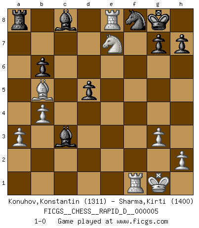 Last move : 1-0 2008 June 29 18:31:4 [Event "FICGS__CHESS__RAPID_D__000005"] [Site "FICGS"] [Date "2008.05.26"] [Round "1"] [White "Konuhov,Konstantin"] [Black "Sharma,Kirti"] [Result "1-0"] [WhiteElo "1311"] [BlackElo "1400"] 1.d4 Nf6 2.c4 e6 3.e3 b6 4.Bd3 Bb7 5.f3 Nc6 6.a3 Ne7 7.Ne2 Ng6 8.e4 d6 9.Nbc3 Be7 10.O-O c5 11.f4 cxd4 12.Nxd4 O-O 13.g3 Qd7 14.Qe2 d5 15.cxd5 Bc5 16.Be3 exd5 17.e5 Ng4 18.e6 fxe6 19.Qxg4 Rf6 20.b4 Bd6 21.Ncb5 Bb8 22.f5 Ne5 23.fxe6 Nxg4 24.exd7 Be5 25.Bg5 a6 26.Bxf6 Nxf6 27.Rae1 Nxd7 28.Nf5 axb5 29.Bxb5 Bc3 30.Re7 Bc8 31.Re8+ Nf8 32.Ne7+ 1-0 Queen's pawn game Kingside Castling by player White (move 10) Kingside Castling by player Black (move 12) Player White won this chess game. Follow this game move after move (download)For me, Chess is life and every game is like a new life. Every Chess player gets to live many lives in one lifetime. (Eduard Gufeld) Du kannst im Schach nur gut werden, wenn du das Spiel liebst. (Robert James Fischer) Fischer era un maestro de claridad y un Rey del posicionamiento astuto. Sus oponentes podían ver hacia donde se dirigía pero eran impotentes para detenerlo. (Bruce Pandolfini) Le plus grand jeu de l'esprit jamais inventé, plus vous l'apprenez, plus vous y prenez du plaisir. (Garry Kasparov) When the going gets tactical, the computers get going. (Hyatt)
