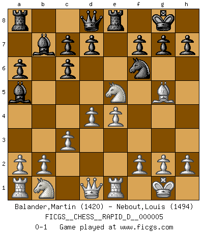 Last move : 0-1 2008 July 11 2:48:29 [Event "FICGS__CHESS__RAPID_D__000005"] [Site "FICGS"] [Date "2008.05.26"] [Round "1"] [White "Balander,Martin"] [Black "Nebout,Louis"] [Result "0-1"] [WhiteElo "1420"] [BlackElo "1494"] 1.e4 e5 2.Nf3 Nc6 3.Bb5 a6 4.Ba4 Nf6 5.O-O Be7 6.Re1 O-O 7.Bxc6 bxc6 8.Nxe5 Bb4 9.c3 Re8 10.d4 Ba5 11.Bg5 Bb7 0-1 This chess game has been lost on time (started : 2008.05.26 17:45:10) Ruy Lopez : Closed defense Kingside Castling by player White (move 5) Kingside Castling by player Black (move 6) Player Black won this chess game. Follow this game move after move (download)The passed pawn is a criminal, who should be kept under lock and key. Mild measures, such as police surveillance, are not sufficient. (Nimzovitch) Offensichtlich kennt Kasparow nichts anderes als Schach, und ich könnte 500 weitere Spieler dieser Sorte benennen. (Judith Polgar) Con o sin el título, Bobby Fischer fue sin lugar a dudas el mas grande jugador de su época. (Burt Hochberg) Mon pion favori sur ma case favorite ! Bronstein en parlant d'un coup de pion en h5 quand il avait les Noirs. Internet: Absolute communication, absolute isolation. (Paul Carvel)