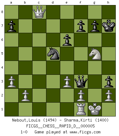 Last move : 1-0 2008 July 25 20:10:47 [Event "FICGS__CHESS__RAPID_D__000005"] [Site "FICGS"] [Date "2008.05.26"] [Round "1"] [White "Nebout,Louis"] [Black "Sharma,Kirti"] [Result "1-0"] [WhiteElo "1494"] [BlackElo "1400"] 1.d4 Nf6 2.c4 e6 3.Nc3 Bb4 4.Bg5 O-O 5.e3 b6 6.Qc2 Bb7 7.Nf3 h6 8.Bh4 Be7 9.Bd3 Nc6 10.O-O Nb4 11.Qd1 Nxd3 12.Qxd3 Bxf3 13.gxf3 d5 14.cxd5 Nxd5 15.Bxe7 Qxe7 16.Rac1 Nb4 17.Qc4 c5 18.dxc5 bxc5 19.Ne4 Rfc8 20.a3 Nd5 21.Nxc5 Qf6 22.Qe2 Rc7 23.Ne4 Qg6+ 24.Ng3 Rac8 25.Qd2 h5 26.Kh1 h4 27.Rxc7 Rxc7 28.Ne4 Qh5 29.Qe2 Rc2 30.Qxc2 Qxf3+ 31.Kg1 h3 32.Qc8+ Kh7 33.Ng5+ 1-0 Nimzo-Indian : Leningrad variation Kingside Castling by player Black (move 4) Kingside Castling by player White (move 10) Player White won this chess game. Follow this game move after move (download)The essence of Chess is thinking about what Chess is. (David Bronstein) Ich habe Kasparov in Rente geschickt. (Veselin Topalov) El Jaque al descubierto es el bombardero del tablero. (Reuben Fine) Aidez vos pièces, elles vous aideront. (Paul Morphy) Convictions are more dangerous enemies of truth than lies. (Friedrich Nietzsche)