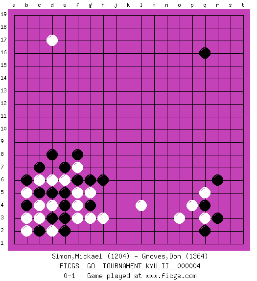 Last move : 0-1 2008 July 24 4:2:26 [Event "FICGS__GO__TOURNAMENT_KYU_II__000004"] [Site "FICGS"] [Date "2008.05.26"] [Round "1"] [Black "Simon,Mickael"] [White "Groves,Don"] [Result "0-1"] [Rating 1 "1204"] [Rating 2 "1364"] 1.q16 c4 2.q4 d17 3.e3 g3 4.e5 d6 5.d8 e6 6.g4 h3 7.f6 f7 8.e7 f5 9.g6 f4 10.d5 c6 11.c5 b5 12.d3 c3 13.c2 b2 14.b4 b3 15.b6 d4 16.e4 f3 17.c7 d2 18.e2 g5 19.h6 l4 20.f8 o3 21.r6 q3 22.r3 p4 23.q2 q5 0-1 This go game has been lost on time (started : 2008.05.26 18:49:21) Here are the names of the openings (joseki) played in the four corners : Corner d4 : c4 e3 Komoku (Somok, Xiao~mu`) 3-4 Point. The komoku (3-4) point is the traditional corner enclosure move.. Ikken Kakari (Hankan Keolch'im, Yi Gua`jiao~, 1-Space Low Pincer). The small knight move is the basic approach move to the 3-4 point stone. It has been continually used for over four centuries. There are limitless variations, with new moves constantly being discovered. Black 2 opens the door to a treaure store of joseki. Corner q4 : q4 l4 Hoshi (Hwajeom, Seongjeom, Xingwei`) 4-4 Point. The star or hoshi (4-4) point, emphasizing influence at the potential expense of territory. Player White won this Go (weiqi, baduk) game. Follow this game move after move (download)White is always trying to kill a bigger group than black is trying to save. (Anonymous) Imagination is more important than knowledge. Knowledge is limited. Imagination encircles the world. (Albert Einstein)