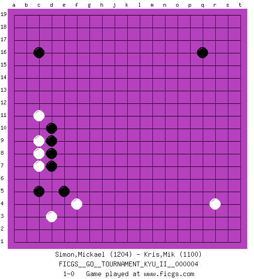 Last move : 1-0 2008 August 1 16:53:17 [Event "FICGS__GO__TOURNAMENT_KYU_II__000004 "] [Site "FICGS"] [Date "2008.05.26"] [Round "1"] [Black "Simon,Mickael "] [White "Kris,Mik "] [Result "1-0"] [Rating 1 "1204"] [Rating 2 "1100"] 1.q16 r4 2.c16 d3 3.c5 c7 4.e5 f4 5.d8 c8 6.d9 c9 7.d10 c11 8.d7 1-0 This go game has been lost on time (started : 2008.05.26 18:49:21) Here are the names of the openings (joseki) played in the four corners : Corner d4 : d3 c5Komoku (Somok, Xiao~mu`) 3-4 Point. The komoku (3-4) point is the traditional corner enclosure move..Ikken Kakari (Hankan Keolch'im, Yi Gua`jiao~, 1-Space Low Pincer). The small knight move is the basic approach move to the 3-4 point stone. It has been continually used for over four centuries. There are limitless variations, with new moves constantly being discovered. Black 2 opens the door to a treaure store of joseki. Corner d16 : c16 c11Komoku (Somok, Xiao~mu`) 3-4 Point. The komoku (3-4) point is the traditional corner enclosure move.. Player Black won this Go (weiqi, baduk) game.Follow this game move after move (download ) Attach to the strongest stone in a pincer. (Anonymous) The obstacle is the path. (Zen proverb)