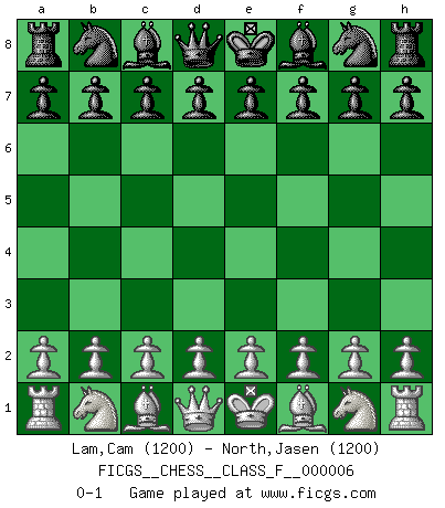 Last move : 0-1 2006 August 29 6:53:13 [Event "FICGS__CHESS__CLASS_F__000006"] [Site "FICGS"] [Date "2006.07.19"] [Round "1"] [White "Lam,Cam"] [Black "North,Jasen"] [Result "0-1"] [WhiteElo "1200"] [BlackElo "1200"] 0-1 This chess game has been lost on time (started : 2006.07.19 22:49:45) Player Black won this chess game. Follow this game move after move (download)I don't believe in psychology. I believe in good moves. (Bobby Fischer) Ein bischen Romantik kann weder im Schach noch in der Liebe schaden. Also versuche ich mich ab und zu daran zu erinnern. (Nigel Short) Yo nunca en mi vida he jugado la Defensa Francesa, que viene siendo la más aburrida de todas las Aperturas. (Wilhelm Steinitz) Le profane ne songe pas à la somme de jouissance dont il se prive, qui méconnaît ce jeu aux ressources aussi variées que passionnantes. (Jean-Marie Jeanton-Lamarche) Never was anything great achieved without danger. (Niccolo Machiavelli)