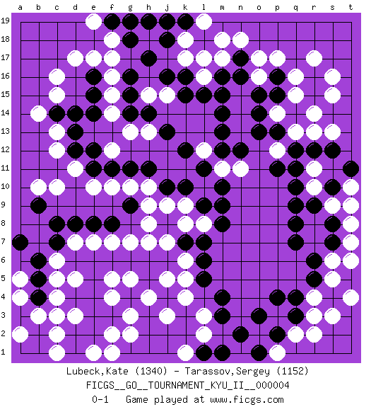 Last move : 0-1 2008 October 6 20:26:37 [Event "FICGS__GO__TOURNAMENT_KYU_II__000004"] [Site "FICGS"] [Date "2008.05.26"] [Round "1"] [Black "Lubeck,Kate"] [White "Tarassov,Sergey"] [Result "0-1"] [Rating 1 "1340"] [Rating 2 "1152"] 1.r16 p17 2.p16 o16 3.p15 l17 4.q4 d17 5.d4 c15 6.r9 k4 7.m3 g3 8.e3 l3 9.m4 c6 10.d6 d7 11.e6 c10 12.l6 r3 13.q3 r4 14.r5 s5 15.r6 s6 16.s7 q2 17.p2 r2 18.h6 j7 19.j6 k6 20.k7 k5 21.l5 k8 22.l7 h7 23.l9 l8 24.j8 k9 25.m8 l10 26.m9 h8 27.k10 j9 28.l11 r13 29.q12 r10 30.q10 r11 31.q11 r8 32.s8 s9 33.q9 t9 34.g6 f5 35.f6 f2 36.e2 l2 37.f3 g2 38.g4 h4 39.h5 j3 40.j10 h10 41.h11 g10 42.j13 l12 43.k12 m11 44.m10 n11 45.m14 n14 46.m13 n13 47.m12 p14 48.n12 p12 49.p11 r17 50.o15 n15 51.n16 o17 52.m16 m17 53.m15 q13 54.r12 p3 55.p4 o2 56.o3 p1 57.n2 c4 58.c7 c5 59.d8 e7 60.e8 f7 61.f8 g7 62.g9 h9 63.c8 d5 64.e5 f4 65.c3 s16 66.r15 s15 67.q14 r14 68.s12 r7 69.q7 t7 70.q8 t8 71.s4 t4 72.s10 s3 73.o1 q16 74.o13 q15 75.o14 t10 76.t11 t6 77.h17 h15 78.k16 l16 79.l15 k17 80.j16 j15 81.k15 g13 82.g11 f10 83.f11 e10 84.e11 d11 85.d12 c12 86.d13 c13 87.e14 f15 88.e15 f16 89.e16 e17 90.g16 f17 91.g15 f14 92.g14 h13 93.h14 f12 94.e12 j5 95.e4 b3 96.b6 c2 97.b4 d3 98.b5 c3 99.d2 e1 100.d1 f1 101.a3 c1 102.b9 b10 103.a7 g5 104.c14 b14 105.d14 c16 106.n17 n18 107.j18 k18 108.g18 f18 109.h19 a2 110.p13 s13 111.k19 l19 112.j19 m18 113.g19 a4 114.f19 e19 115.m1 a5 116.l1 k1 0-1 Here are the names of the openings (joseki) played in the four corners : Corner q16 : r16 p17 Komoku (Somok, Xiao~mu`) 3-4 Point. The komoku (3-4) point is the traditional corner enclosure move.. Ikken Kakari (Hankan Keolch'im, Yi Gua`jiao~, 1-Space Low Pincer). The small knight move is the basic approach move to the 3-4 point stone. It has been continually used for over four centuries. There are limitless variations, with new moves constantly being discovered. White 2 opens the door to a treaure store of joseki. Corner d4 : d4 g3 Hoshi (Hwajeom, Seongjeom, Xingwei`) 4-4 Point. The star or hoshi (4-4) point, emphasizing influence at the potential expense of territory. Nikken Kakari (Dukan Keolch'im, E`r Gua`jiao~, 2-Space Low Approach). Black typically answers by 7-3 or 3-5 (which is not joseki). Player White won this Go (weiqi, baduk) game. Follow this game move after move (download)One point in the center is worth ten in the corner. (Anonymous) Ah, the Socrating method. The best way we have of teaching everything-apart from juggling chainsaws. (Gregory House, House M.D.)