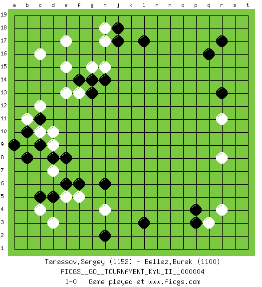 Last move : 1-0 2008 August 2 4:53:41 [Event "FICGS__GO__TOURNAMENT_KYU_II__000004"] [Site "FICGS"] [Date "2008.05.26"] [Round "1"] [Black "Tarassov,Sergey"] [White "Bellaz,Burak"] [Result "1-0"] [Rating 1 "1152"] [Rating 2 "1100"] 1.q16 r4 2.p4 d3 3.c5 c4 4.d5 c16 5.c9 q3 6.p3 e17 7.r17 c10 8.c11 d10 9.b10 b9 10.b8 b11 11.a9 c12 12.l17 h17 13.j18 h18 14.j17 h15 15.g13 f13 16.f14 e13 17.h14 g15 18.g14 e15 19.l3 h4 20.h6 d7 21.e8 e5 22.e6 d9 23.d8 f5 24.f6 r8 25.r13 r11 26.h2 1-0 This go game has been lost on time (started : 2008.05.26 18:49:21) Here are the names of the openings (joseki) played in the four corners : Corner q4 : r4 p4 Komoku (Somok, Xiao~mu`) 3-4 Point. The komoku (3-4) point is the traditional corner enclosure move.. Ikken Takagakari (Hankan Nop'dakeolch'im, Yi Gaogua`jiao~, 1-Space High Approach). The 5-4 approach move has become more popular in modern times, as modern Go emphasizes speed and influence. Corner d4 : d3 c5 Komoku (Somok, Xiao~mu`) 3-4 Point. The komoku (3-4) point is the traditional corner enclosure move.. Ikken Kakari (Hankan Keolch'im, Yi Gua`jiao~, 1-Space Low Pincer). The small knight move is the basic approach move to the 3-4 point stone. It has been continually used for over four centuries. There are limitless variations, with new moves constantly being discovered. Black 2 opens the door to a treaure store of joseki. Player Black won this Go (weiqi, baduk) game. Follow this game move after move (download)Do not make moves that strengthen your opponent ! (Anonymous) Fear is the path to the dark side. Fear leads to anger; anger leads to hate; hate leads to suffering. I sense much fear in you. (Master Yoda in Star Wars ep.1)