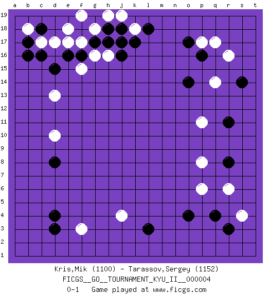 Last move : 0-1 2008 August 9 17:25:54 [Event "FICGS__GO__TOURNAMENT_KYU_II__000004 "] [Site "FICGS"] [Date "2008.05.26"] [Round "1"] [Black "Kris,Mik "] [White "Tarassov,Sergey "] [Result "0-1"] [Rating 1 "1100"] [Rating 2 "1152"] 1.d4 r16 2.c16 e17 3.d15 f15 4.g17 h16 5.e16 f17 6.f16 g16 7.h17 j17 8.j18 c17 9.b17 d17 10.b16 g18 11.h18 k18 12.k17 j19 13.j16 h19 14.j17 f19 15.l18 e18 16.p16 p17 17.o17 q17 18.o14 q14 19.q4 r6 20.r8 p6 21.o4 p8 22.r11 p11 23.s14 s4 24.r3 j4 25.l3 f3 26.d3 d10 27.d8 d13 28.c18 b18 0-1 This go game has been lost on time (started : 2008.05.26 18:49:21) Here are the names of the openings (joseki) played in the four corners : Corner d16 : c16 e17Komoku (Somok, Xiao~mu`) 3-4 Point. The komoku (3-4) point is the traditional corner enclosure move..Ikken Kakari (Hankan Keolch'im, Yi Gua`jiao~, 1-Space Low Pincer). The small knight move is the basic approach move to the 3-4 point stone. It has been continually used for over four centuries. There are limitless variations, with new moves constantly being discovered. White 2 opens the door to a treaure store of joseki. Corner q16 : r16 l18Komoku (Somok, Xiao~mu`) 3-4 Point. The komoku (3-4) point is the traditional corner enclosure move.. Corner q4 : q4 r6Hoshi (Hwajeom, Seongjeom, Xingwei`) 4-4 Point. The star or hoshi (4-4) point, emphasizing influence at the potential expense of territory.Ikken Kakari (Hankan Keolch'im, Yi Gua`jiao~, 1-Space Low Approach). White 2 is the standard approach move to the 4-4. Corner d4 : d4 j4Hoshi (Hwajeom, Seongjeom, Xingwei`) 4-4 Point. The star or hoshi (4-4) point, emphasizing influence at the potential expense of territory. Player White won this Go (weiqi, baduk) game.Follow this game move after move (download ) There are players who don't accept exchange: they play many moves that perpetuate a previous state of the game. (Pierre Audouard) Do you know these so called Volunteers don't even get paid! (Simpsons)