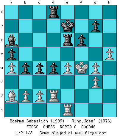 Last move : 1/2-1/2 2008 July 11 16:15:31 [Event "FICGS__CHESS__RAPID_A__000046"] [Site "FICGS"] [Date "2008.05.27"] [Round "1"] [White "Boehme,Sebastian"] [Black "Riha,Josef"] [Result "1/2-1/2"] [WhiteElo "1999"] [BlackElo "1976"] 1.e4 e5 2.Nf3 Nc6 3.Bb5 a6 4.Ba4 Nf6 5.O-O Be7 6.Re1 b5 7.Bb3 O-O 8.h3 Bb7 9.d3 Bc5 10.Nc3 h6 11.Bd2 d6 12.Nd5 a5 13.a4 b4 14.Be3 Nd4 15.Nxf6+ Qxf6 16.Nxd4 Bxd4 17.Bxd4 exd4 18.Qh5 Qe5 19.Qh4 Qg5 20.Qxg5 hxg5 21.f3 Rad8 22.Kf2 Rfe8 23.Rh1 d5 24.Rae1 dxe4 25.dxe4 Ba6 26.Rd1 Rd6 27.h4 g4 28.Rhe1 c5 29.fxg4 c4 30.Ba2 f6 31.Kf3 Kf7 32.h5 R6d8 33.Rd2 Re6 34.Kf4 Ke7 35.g3 1/2-1/2 Ruy Lopez : Closed, 7...O-O Kingside Castling by player White (move 5) Kingside Castling by player Black (move 7) This chess game ended in a draw. Follow this game move after move (download)I like the moment when I break a man's ego. (Bobby Fischer) Zum Sieg gelangt man nicht, wenn man gut, sondern nur wenn man besser spielt (Savielly Grigorievitsch Tartakower) Aquel que ve no otra dirección en el juego que la de dar Jaque Mate a su oponente, nunca será un buen jugador de Ajedrez. (Euwe) Le jeu d'échecs fait naître et fortifie en nous plusieurs qualités précieuses dans le cours de l'existence, telles que la prévoyance, la circonspection, la prudence, et la persévérance. (Benjamin Franklin - 1783, la morale des échecs) The good fighters of old first put themselves beyond the possibility of defeat, and then waited for an opportunity of defeating the enemy. (Sun Tzu)