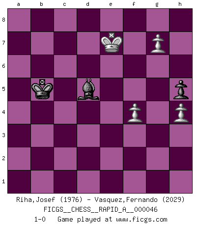 Last move : 1-0 2008 July 8 1:35:14 [Event "FICGS__CHESS__RAPID_A__000046"] [Site "FICGS"] [Date "2008.05.27"] [Round "1"] [White "Riha,Josef"] [Black "Vasquez,Fernando"] [Result "1-0"] [WhiteElo "1976"] [BlackElo "2029"] 1.d4 d5 2.c4 dxc4 3.Nf3 Nf6 4.e3 g6 5.Bxc4 Bg7 6.O-O O-O 7.Nc3 Nc6 8.h3 a6 9.e4 b5 10.Bd3 Nd7 11.Be3 Nb6 12.d5 Ne5 13.Nxe5 Bxe5 14.a4 b4 15.Ne2 a5 16.Nd4 Bxd4 17.Bxd4 c6 18.Qc1 cxd5 19.Qh6 f6 20.e5 Rf7 21.exf6 exf6 22.Rfe1 Bd7 23.b3 Nc8 24.Qe3 Bc6 25.Rac1 Qd7 26.Be2 Nd6 27.Bg4 Nf5 28.Bxf5 gxf5 29.Qf4 Re8 30.Rxe8+ Qxe8 31.Qxf5 Bb7 32.Qg4+ Rg7 33.Qf4 Rf7 34.Qg3+ Rg7 35.Qd6 Qe7 36.Qb8+ Qf8 37.Qxf8+ Kxf8 38.Rc5 Re7 39.Rxa5 Re4 40.Bc5+ Ke8 41.Rb5 Bc6 42.Rb6 Kd7 43.Kf1 h5 44.f3 Re8 45.Rxb4 Rc8 46.Bd4 f5 47.a5 Ra8 48.Bb6 Kc8 49.Kf2 Kb7 50.Bd4 Kc7 51.Ke3 Bd7 52.Bb6+ Kc6 53.Kf4 Bc8 54.g3 Bd7 55.Rd4 Be6 56.h4 Kb5 57.b4 Rg8 58.Bc5 Rg6 59.Rd1 Rg8 60.Ke5 Rg6 61.Rd2 Bf7 62.Kf4 Bg8 63.Ra2 Bf7 64.a6 Rxa6 65.Rxa6 Kxa6 66.Kxf5 Be8 67.g4 Kb5 68.g5 Kc4 69.g6 d4 70.Bxd4 Kxd4 71.Kf6 Bc6 72.g7 Bd5 73.b5 Kc5 74.Ke7 Kxb5 75.f4 1-0 QGA, Smyslov variation Kingside Castling by player White (move 6) Kingside Castling by player Black (move 6) 10 pieces endgame at move 66 : White KBPPPP , Black KBPP WHITE : King + 1 Bishop 4 Pawns BLACK : King + 1 Bishop 2 Pawns 9 pieces endgame at move 70 : White KBPPPP , Black KBP WHITE : King + 1 Bishop 4 Pawns BLACK : King + 1 Bishop 1 Pawn 8 pieces endgame at move 70 : White KPPPP , Black KBP WHITE : King + 4 Pawns BLACK : King + 1 Bishop 1 Pawn 7 pieces endgame at move 74 : White KPPP , Black KBP WHITE : King + 3 Pawns BLACK : King + 1 Bishop 1 Pawn Player White won this chess game. Follow this game move after move (download)All I want to do, ever, is just play Chess. (Bobby Fischer) Ein typischer, sehr verbreiteter Gedankenschädling ist der, daß der betreffende Amateur von der Annanhme ausgeht, daß jeder einzelne Zug etwas zu leisten habe. (Aaron Nimzowitsch) El hombre es un frívolo, una creatura engañosa y como un jugador de Ajedrez, se preocupa mas por el proceso de obtener su meta que de la meta por sí misma. (Dostoyevsky) A chaque perte on perd un peu de soi. (Joël Lautier) Creativity involves breaking out of established patterns in order to look at things in a different way. (Edward De Bono)
