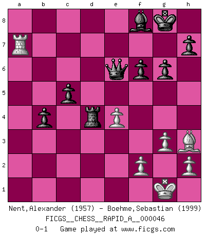 Last move : 0-1 2008 July 28 13:50:17 [Event "FICGS__CHESS__RAPID_A__000046"] [Site "FICGS"] [Date "2008.05.27"] [Round "1"] [White "Nent,Alexander"] [Black "Boehme,Sebastian"] [Result "0-1"] [WhiteElo "1957"] [BlackElo "1999"] 1.c4 e5 2.g3 Nf6 3.Bg2 d5 4.cxd5 Nxd5 5.Nf3 Nc6 6.O-O Nb6 7.d3 Be7 8.Nbd2 O-O 9.a3 a5 10.b3 Be6 11.Bb2 f6 12.Qc2 Qd7 13.e3 Rfd8 14.d4 exd4 15.Nxd4 Nxd4 16.Bxd4 c5 17.Bxc5 Rac8 18.b4 Nd5 19.Nb3 b6 20.e4 Nxb4 21.axb4 axb4 22.Rfd1 Qc7 23.Rxd8+ Rxd8 24.Nd4 Rxd4 25.Qa4 bxc5 26.Qe8+ Bf8 27.Qxe6+ Qf7 28.Bh3 g6 29.Ra7 Qxe6 0-1 English Opening Kingside Castling by player White (move 6) Kingside Castling by player Black (move 8) Player Black won this chess game. Follow this game move after move (download)A man that will take back a move at Chess will pick a pocket. (Richard Fenton) Man braucht nicht immer den besten Zug zu spielen: Ein Zug muß aktiv, unternehmungslustig, korrekt und schön sein. (David Bronstein) Ciertamente el estado mental actual de Bobby Fischer es una tragedia. Uno de los mas grandes jugadores de Ajedrez del mundo -el orgullo y pena del Ajedrez Americano. (Frank Brady) Les échecs sont un jeu terrible. Si vous n'avez pas le centre, votre adversaire a une position plus libre. Par contre, si vous avez le centre, alors vous avez vraiment quelque chose pour laquelle vous inquiéter ! (Siegbert Tarrasch) The modern world has divided itself into Conservatives and Progressives. The business of Progressives is to go on making mistakes. The business of the Conservatives is to prevent the mistakes from being corrected. (G.K. Chesterton)