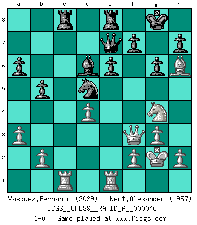 Last move : 1-0 2008 July 28 13:51:4 [Event "FICGS__CHESS__RAPID_A__000046"] [Site "FICGS"] [Date "2008.05.27"] [Round "1"] [White "Vasquez,Fernando"] [Black "Nent,Alexander"] [Result "1-0"] [WhiteElo "2029"] [BlackElo "1957"] 1.e4 c5 2.d4 cxd4 3.c3 g6 4.cxd4 d5 5.exd5 Nf6 6.Bb5+ Nbd7 7.d6 e6 8.Nf3 Bxd6 9.O-O O-O 10.Nc3 a6 11.Bd3 Qc7 12.Bg5 b5 13.Ne4 Nxe4 14.Bxe4 Bb7 15.Rc1 Qb8 16.Qd3 Nb6 17.Bh6 Bxe4 18.Qxe4 Re8 19.g3 Nd5 20.Ne5 Qa7 21.Rfe1 Rac8 22.a3 Qe7 23.Kg2 Nf6 24.Qh4 Nd5 25.Qe4 Nf6 26.Qf3 Nd5 27.Ng4 1-0 Sicilian : Smith-Morra gambit Kingside Castling by player White (move 9) Kingside Castling by player Black (move 9) Player White won this chess game. Follow this game move after move (download)There just isn't enough televised Chess. (David Letterman) Der 70jährige Viktor Kortschnoi: Die Rentenanstalt wollte mich zwingen in Rente zu gehen. Meine Frau erhält jetzt eine Pension- und ich zahle weiter in die Rentenkasse ein! (Viktor Kortschnoi) Ayuda a tus piezas para que ellas te puedan ayudar. (Paul Morphy) Demandez au pauvre Cg1 ce qu'il en pense. Eduard Gufeld à propos de la variante Saemisch de l'Est-Indienne. At work, the authority of a person is inversely proportional to the number of pens that person is carrying. (Dan Rotaru)