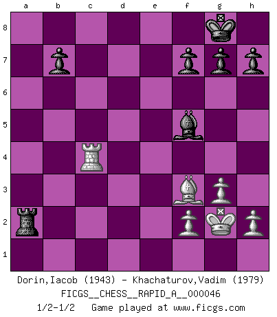 Last move : 1/2-1/2 2008 July 4 17:29:50 [Event "FICGS__CHESS__RAPID_A__000046"] [Site "FICGS"] [Date "2008.05.27"] [Round "1"] [White "Dorin,Iacob"] [Black "Khachaturov,Vadim"] [Result "1/2-1/2"] [WhiteElo "1943"] [BlackElo "1979"] 1.Nf3 Nf6 2.g3 d5 3.Bg2 c5 4.O-O Nc6 5.d4 e6 6.c4 dxc4 7.dxc5 Qxd1 8.Rxd1 Bxc5 9.Nbd2 c3 10.bxc3 O-O 11.Nb3 Be7 12.Nfd4 Nxd4 13.cxd4 Nd5 14.e4 Nc3 15.Re1 Bd7 16.d5 exd5 17.exd5 Rfe8 18.Be3 Rac8 19.Bxa7 Bf6 20.Nc5 Ne2+ 21.Kh1 Bf5 22.Rad1 Bd4 23.Bf3 Bxc5 24.Bxc5 Rxc5 25.Rxe2 Rxe2 26.Bxe2 Bc2 27.Rd4 Rxd5 28.Rc4 Bf5 29.Kg2 Rd2 30.Bf3 Rxa2 1/2-1/2 Reti Opening Kingside Castling by player White (move 4) Kingside Castling by player Black (move 10) This chess game ended in a draw. Follow this game move after move (download)Fischer is under obligation to nobody. (Joseph Platz) Woher wissen wir, daß der Neanderthaler Blindschach gespielt hat? -- Bei Ausgrabungen wurden keine Schachbretter und Figuren gefunden. (Anonymous) Una buena ofensiva y una buena defensa, comienzan ambas con un buen desarrollo. (Bruce A. Moon) Mon pion favori sur ma case favorite ! Bronstein en parlant d'un coup de pion en h5 quand il avait les Noirs. I'm extremely disappointed. I send you out for exciting, new designer drugs, you come back with tomato sauce. (Gregory House, House M.D.)