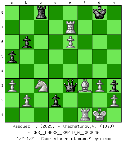 Last move : 1/2-1/2 2008 July 4 23:31:21 [Event "FICGS__CHESS__RAPID_A__000046"] [Site "FICGS"] [Date "2008.05.27"] [Round "1"] [White "Vasquez,Fernando"] [Black "Khachaturov,Vadim"] [Result "1/2-1/2"] [WhiteElo "2029"] [BlackElo "1979"] 1.e4 c5 2.d4 e6 3.Nf3 cxd4 4.Nxd4 a6 5.Bd3 Bc5 6.Nb3 Be7 7.O-O d6 8.Qg4 g6 9.Qg3 Nc6 10.Nc3 h5 11.f4 h4 12.Qh3 Bd7 13.Be3 Nf6 14.a3 e5 15.f5 gxf5 16.exf5 d5 17.Bg5 Ng8 18.Bxe7 Ncxe7 19.Qe3 f6 20.Qc5 b6 21.Qb4 h3 22.g3 Nh6 23.Rad1 a5 24.Qd6 Nf7 25.Qxf6 Kf8 26.Nd4 Rh6 27.Ne6+ Bxe6 28.fxe6 Rxf6 29.Rxf6 Qd6 30.Rdf1 e4 31.Be2 Qe5 32.Rxf7+ Kg8 33.Rxe7 d4 34.Na4 d3 35.cxd3 exd3 36.Bf3 Rc8 37.Kh1 d2 38.Nc3 Qe1 39.Kg1 Qe3+ 1/2-1/2 Sicilian : Smith-Morra gambit Kingside Castling by player White (move 7) This chess game ended in a draw. Follow this game move after move (download)The passion for playing Chess is one of the most unaccountable in the world. (H.G. Wells) Mein erstes Ziel war nicht, die Partie zu gewinnen, sondern eine Figur zu opfern. -- der junge (Wilhelm Steinitz) Solo los afeminados hacen el Enroque. (Rob Sillars) Ne tendez aucun piège pour le plaisir ! Ne jouez rien dans l'espoir que l'adversaire réagisse de façon stupide ! Prenez toujours pour acquis que l'adversaire va trouver le meilleur coup ! Ne jouez jamais de coup dans l'espoir que l'adversaire ne voie pas la menace ! Chacun de vos coups doit améliorer la position d'une façon ou d'une autre. Somewhere in the world there is an epigram for every dilemma. (Hendrik Willem van Loon)