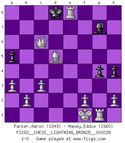 Last move : 1-0 2009 January 11 3:29:4 [Event "FICGS__CHESS__LIGHTNING_BRONZE__000038"] [Site "FICGS"] [Date "2009.01.11"] [Round "1"] [White "Parker,Aaron"] [Black "Maney,Eddie"] [Result "1-0"] [WhiteElo "1343"] [BlackElo "1560"] 1.e4 e5 2.Nf3 f6 3.Nc3 Nc6 4.a3 b6 5.Nd5 Na5 6.d3 Ne7 7.Nc3 f5 8.Nd5 c6 9.Nxe7 Qxe7 10.exf5 Qf6 11.d4 exd4 12.Nxd4 c5 13.Nb5 Qe5+ 14.Be2 Qxf5 15.Nc7+ Kd8 16.Nxa8 Bb7 17.Nxb6 Bxg2 18.Rg1 Bc6 19.Nc4 Qh3 20.Bf4 g5 21.Bg3 Bg7 22.c3 Qe6 23.Nxa5 h6 24.Nxc6+ Qxc6 25.Bf3 Qe6+ 26.Kf1 Re8 27.Qd2 g4 28.Bd5 Qd6 29.Bxd6 a5 30.Bxc5 Re7 31.Bb6+ Ke8 32.Qd3 h5 33.Qg6+ Kf8 34.Bc5 d6 35.Bxd6 h4 36.Bxe7+ Kxe7 37.Re1+ Kd7 38.Qe6+ Kd8 39.Qe8+ Kc7 40.Qc6+ Kd8 41.Re8+ 1-0 Damiano's defense Player White won this chess game. Follow this game move after move (download)I'm not a materialistic person, in that, I don't suffer the lack or loss of money. The absence of worldly goods I don't look back on. For Chess is a way I can be as materialistic as I want without having to sell my soul. (Jamie Walter Adams) Es hat in meinem Leben Zeiten gegeben, da ich sehr nahe daran war zu glauben, daß ich auch nicht eine einzige Schachpartie verlieren könnte. (José Raúl Capablanca) Un mal plan es mejor que no tener ningún plan. (Frank Marshall) D'abord les bases : Jouez et étudiez, puis étudiez et jouez, ensuite jouez et étudiez, puis étudiez et jouez. Deuxièmement : Donnez toujours le meilleur de vous-même ! (Ken Smith) Hello Thibault, if I have had a plan (and I had one, I hope), I have forgotten it during the last week... - Hello Heinz-Georg. What do you mean a plan ? (Anonymous players, during a Big Chess game)