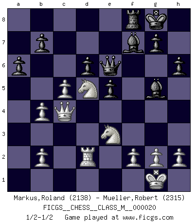 Last move : 1/2-1/2 2008 August 28 9:7:4 [Event "FICGS__CHESS__CLASS_M__000020"] [Site "FICGS"] [Date "2008.05.29"] [Round "1"] [White "Markus,Roland"] [Black "Mueller,Robert"] [Result "1/2-1/2"] [WhiteElo "2138"] [BlackElo "2315"] 1.e4 c5 2.Nf3 d6 3.d4 cxd4 4.Nxd4 Nf6 5.Nc3 a6 6.Be3 e5 7.Nf3 Be7 8.Bc4 O-O 9.O-O Be6 10.Bb3 Nc6 11.Qe2 Na5 12.Rfd1 Nxb3 13.axb3 Qc7 14.Bg5 Rac8 15.Rd3 h6 16.Bxf6 Bxf6 17.Ne1 Qc6 18.Rad1 Be7 19.Nd5 Bd8 20.Rc3 Qd7 21.Rxc8 Qxc8 22.c4 Qc6 23.Nc2 f5 24.exf5 Bxf5 25.Nce3 Bg6 26.b4 Bg5 27.Qg4 Qe8 28.c5 Bh5 29.Qc4 Qe6 30.Rd2 Bf7 31.Qe4 Bg6 32.Qc4 Bf7 1/2-1/2 Sicilian : Najdorf, Byrne (English) attack Kingside Castling by player Black (move 8) Kingside Castling by player White (move 9) This chess game ended in a draw. Follow this game move after move (download)There are tough players and nice guys, and I'm a tough player. (Bobby Fischer) Der beste Spieler in einem Turnier gewinnt es nie. Er landet auf Platz zwei oder drei. (Siegbert Tarrasch) La mitad de las variaciones que son calculadas en una partida de torneo, resultan ser completamente superfluas. Desafortunadamente, nadie sabe por adelantado cual mitad. (Jan Tinman) Les échecs, c'est l'art d'analyser. (Mikhail Botvinnik) Chess, like love, like music, has the power to make people happy. (Siegbert Tarrasch)