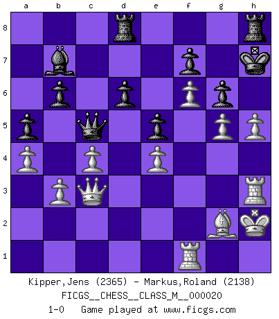 Last move : 1-0 2009 January 29 16:38:47 [Event "FICGS__CHESS__CLASS_M__000020"] [Site "FICGS"] [Date "2008.05.29"] [Round "1"] [White "Kipper,Jens"] [Black "Markus,Roland"] [Result "1-0"] [WhiteElo "2365"] [BlackElo "2138"] 1.Nf3 Nf6 2.c4 e6 3.Nc3 c5 4.g3 b6 5.Bg2 Bb7 6.O-O Be7 7.d4 cxd4 8.Qxd4 d6 9.Rd1 a6 10.b3 Nbd7 11.e4 Qc8 12.Bb2 O-O 13.h3 Qc7 14.Nh2 Rad8 15.Rac1 Ne5 16.Ba3 h5 17.Nf3 Rfe8 18.Qe3 Ng6 19.Na4 Nd7 20.h4 Bc6 21.Nc3 Bb7 22.Ng5 Nge5 23.Qe2 Nf6 24.Qc2 Nfg4 25.Qd2 Ng6 26.Ne2 N4e5 27.Bb4 Qb8 28.Bc3 Bf6 29.Rc2 Qc8 30.Nf4 Nxf4 31.Qxf4 Qc7 32.Qd2 a5 33.Bb2 Ng4 34.Bxf6 Nxf6 35.Rc3 Rd7 36.Rd3 Red8 37.Qe2 Qc6 38.R3d2 g6 39.Qf3 Nh7 40.a4 Qc5 41.Qf4 Nxg5 42.hxg5 Bc6 43.Rd3 Qe5 44.Qe3 Qc5 45.Qd2 Qe5 46.Qc1 Qc5 47.Kh2 Qe5 48.f4 Qc5 49.Qc3 e5 50.f5 Kg7 51.Rf1 Bb7 52.f6+ Kh7 53.g4 Rh8 54.gxh5 R7d8 55.Rh3 1-0 Reti Opening Kingside Castling by player White (move 6) Kingside Castling by player Black (move 12) Player White won this chess game. Follow this game move after move (download)You must take your opponent into a deep dark forest where 2+2=5, and the path leading out is only wide enough for one. (Mikhail Tal) Im Blitz ist es einfacher mit einer Figur weniger anzugreifen, als sich mit einer Mehrfigur zu verteidigen. (Mikhail Nekhemyevich Tal) El Ajedrez es un juego de pelea el cual es puramente intelectual e incluye la suerte. (Richard Reti) Pour moi, les échecs ne sont pas un jeu mais un art. (Alexandre Alekhine) The man who strikes first admits that his ideas have given out. (Chinese proverb)