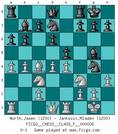 Last move : 0-1 2006 December 12 12:6:38 [Event "FICGS__CHESS__CLASS_F__000006"] [Site "FICGS"] [Date "2006.07.19"] [Round "1"] [White "North,Jasen"] [Black "Jankovic,Mladen"] [Result "0-1"] [WhiteElo "1200"] [BlackElo "1200"] 1.e4 e5 2.Nf3 d6 3.Bc4 b6 4.d4 Bb7 5.Nc3 Nd7 6.O-O a6 7.a4 Be7 8.Re1 Ngf6 9.Bg5 O-O 10.b4 Ng4 11.h3 Bxg5 0-1 Philidor's defense Kingside Castling by player White (move 6) Kingside Castling by player Black (move 9) Player Black won this chess game. Follow this game move after move (download)The hallmark of the artist is simplicity. (Larry Evans) Sie bekommen vielleicht den Eindruck, dass die Spitzenspieler überhaupt gar nicht so stark sind. Aber das stimmt nicht. Es ist eine Illusion. Mit einem Computer an der Seite ist es sehr leicht, Urteile zu fällen, aber wenn man alleine am Brett sitzt, sieht die Sache ganz anders aus. (Vladimir Kramnik) Puntos débiles o agujeros en la posición de tu oponente deben de ser ocupados por piezas, no Peones. (Siegbert Tarrasch) Je fais ceci parce que dans cinquante coups j'obtiendrai cela; je m'appelle Mikhail Moisevitch Botvinnik. (Botvinnik) Knowledge will give you power, but character respect. (Bruce Lee)