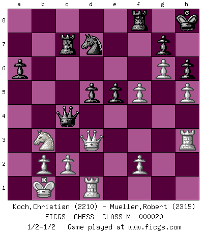 Last move : 1/2-1/2 2008 August 4 17:2:29 [Event "FICGS__CHESS__CLASS_M__000020"] [Site "FICGS"] [Date "2008.05.29"] [Round "1"] [White "Koch,Christian"] [Black "Mueller,Robert"] [Result "1/2-1/2"] [WhiteElo "2210"] [BlackElo "2315"] 1.e4 c5 2.Nf3 d6 3.d4 cxd4 4.Nxd4 Nf6 5.Nc3 a6 6.Be3 e5 7.Nb3 Be6 8.h3 Be7 9.Qf3 b5 10.O-O-O Nbd7 11.g4 Nb6 12.g5 Nfd7 13.h4 O-O 14.Nd5 Nc4 15.Kb1 Kh8 16.Nxe7 Qxe7 17.h5 f6 18.g6 h6 19.Bh3 Rac8 20.Nd2 Nxe3 21.Qxe3 Bxh3 22.Rxh3 f5 23.exf5 d5 24.Qa7 b4 25.a3 Qd6 26.axb4 Rc7 27.Qe3 Qxb4 28.Nb3 Qc4 29.Qd3 Qg4 30.Qf3 Qc4 31.Qd3 1/2-1/2 Sicilian : Najdorf, Byrne (English) attack Queenside Castling by player White (move 10) Kingside Castling by player Black (move 13) This chess game ended in a draw. Follow this game move after move (download)Of all my Russian books, the defense contains and diffuses the greatest 'warmth' which may seem odd seeing how supremely abstract Chess is supposed to be. (Vladimir Nabokov) Schach ist Kampf, hauptsächlich jedoch gegen die eigenen Fehler. (Savielly Grigorievitsch Tartakower) Yo jugué Ajedrez con el y a veces le pude haber ganado solo que siempre devuelve su última jugada y juega la partida de manera diferente. (Mark Twain) Les Echecs mettent en conflit, non pas deux intelligences, mais deux volontés. (Lasker) Memory is a complicated thing, a relative to truth, but not its twin. (Barbara Kingsolver, Animal Dreams)