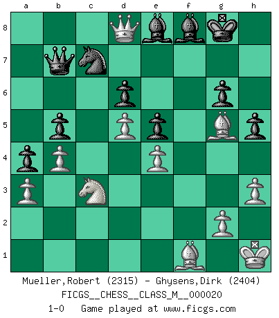 Last move : 1-0 2008 October 5 0:50:22 [Event "FICGS__CHESS__CLASS_M__000020"] [Site "FICGS"] [Date "2008.05.29"] [Round "1"] [White "Mueller,Robert"] [Black "Ghysens,Dirk"] [Result "1-0"] [WhiteElo "2315"] [BlackElo "2404"] 1.e4 e5 2.Nf3 Nc6 3.Bb5 a6 4.Ba4 Nf6 5.O-O Be7 6.Re1 b5 7.Bb3 d6 8.c3 O-O 9.h3 Na5 10.Bc2 c5 11.d4 Qc7 12.Nbd2 Rd8 13.b3 Bd7 14.Nf1 g6 15.Bg5 cxd4 16.cxd4 Nc6 17.Rc1 Qa5 18.d5 Nb4 19.Bd2 Qa3 20.Bb1 a5 21.Ng3 Re8 22.Re2 Rac8 23.Bc3 Na6 24.Rec2 a4 25.Bb2 Qb4 26.a3 Qa5 27.b4 Qb6 28.Rxc8 Rxc8 29.Rxc8+ Bxc8 30.Bc1 Bd7 31.Ne2 Nc7 32.Bg5 Bd8 33.Bd3 Qb8 34.Nc3 Nh5 35.Be3 Bf6 36.Qd2 Bg7 37.Be2 Be8 38.Ne1 Nf4 39.Bg4 Qd8 40.Nd3 h5 41.Bd1 Nxd3 42.Qxd3 Qb8 43.Bg5 Bd7 44.Qd2 Kh7 45.Be2 Ne8 46.Be3 Qb7 47.f3 Nc7 48.Bf1 Be8 49.Qf2 Kg8 50.Qh4 f6 51.Kh1 Kf7 52.f4 Kg8 53.fxe5 fxe5 54.Qd8 Bf8 55.Bg5 1-0 Ruy Lopez : Closed Kingside Castling by player White (move 5) Kingside Castling by player Black (move 8) Player White won this chess game. Follow this game move after move (download)I won't play with you anymore. You have insulted my friend. - When an opponent cursed himself for a blunder. (Miguel Najdorf) Warum muß ich gegen diesen IDIOTEN verlieren? (Aaron Nimzowitsch) La estratégia requiere pensar, la táctica requiere observación. (Max Euwe) Même si vous avez un bon coup à faire, regardez toujours s'il n'y en a pas un qui lui soit préférable. (Pedro Damiano) All the biggest technological inventions created by man - the airplane, the automobile, the computer - says little about his intelligence, but speaks volumes about his laziness. (Mark Kennedy)