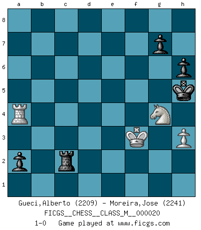 Last move : 1-0 2009 January 23 19:35:55 [Event "FICGS__CHESS__CLASS_M__000020"] [Site "FICGS"] [Date "2008.05.29"] [Round "1"] [White "Gueci,Alberto"] [Black "Moreira,Jose"] [Result "1-0"] [WhiteElo "2209"] [BlackElo "2241"] 1.e4 e5 2.Nf3 Nc6 3.Bb5 a6 4.Ba4 Nf6 5.O-O b5 6.Bb3 Bb7 7.Re1 Be7 8.d4 Nxd4 9.Bxf7+ Kf8 10.Bd5 c6 11.Nxe5 cxd5 12.Qxd4 dxe4 13.Qd1 Rc8 14.c3 Rc5 15.Ng4 Kf7 16.Be3 Rf5 17.a4 Re8 18.Nxf6 Bxf6 19.axb5 Rxb5 20.Na3 Ra5 21.Qb3+ Bd5 22.Qc2 Bb7 23.Rad1 Re6 24.Nc4 Rd5 25.Qa4 Rd3 26.Bf4 Qe7 27.Ne3 Kg8 28.Qb3 Ba8 29.Nf5 Qf7 30.Nd6 Rxd1 31.Rxd1 Qf8 32.h3 h6 33.Be3 Bc6 34.Nc4 Qf7 35.Na5 Re5 36.Qb8+ Re8 37.Qb4 Bd5 38.Rd2 Be5 39.Qc5 Ba2 40.c4 Qe6 41.Rd1 Rb8 42.Bd4 Bd6 43.Qa7 Bb3 44.Ra1 Be5 45.Bc3 Qe8 46.Rc1 Ba4 47.Bd4 Kh8 48.Bxe5 Qxe5 49.b3 Bxb3 50.Rb1 e3 51.fxe3 Rb4 52.Nxb3 Qe4 53.Rb2 Qxc4 54.Qd4 d5 55.Qd1 Qc3 56.Rb1 Qxe3+ 57.Kh1 Rb5 58.Qc2 Qe4 59.Qxe4 dxe4 60.Kg1 e3 61.Kf1 a5 62.Ke2 a4 63.Nd2 Rg5 64.Kxe3 Rxg2 65.Ne4 Ra2 66.Kf4 Ra3 67.Rb8+ Kh7 68.Kg4 Rb3 69.Ra8 Rb4 70.Kf3 Rb3+ 71.Kg2 a3 72.Ra7 Kg6 73.Ra5 Rb2+ 74.Kf3 a2 75.Nf2 Rd2 76.Ra6+ Kh5 77.Ra5+ Kg6 78.Ra8 Kh5 79.Ra4 Rc2 80.Ng4 1-0 Ruy Lopez : Archangelsk (counterthrust) variation Kingside Castling by player White (move 5) 10 pieces endgame at move 64 : White KRNPP , Black KRPPP WHITE : King + 1 Rook 1 Knight 2 Pawns BLACK : King + 1 Rook 3 Pawns 9 pieces endgame at move 64 : White KRNP , Black KRPPP WHITE : King + 1 Rook 1 Knight 1 Pawn BLACK : King + 1 Rook 3 Pawns Player White won this chess game. Follow this game move after move (download)Pawns: they are the soul of this game, they alone form the attack and defense. (Philidor) Die Arbeit ist etwas Unnatürliches. Die Faulheit allein ist göttlich. (Anatole France) La mitad de las variaciones que son calculadas en una partida de torneo, resultan ser completamente superfluas. Desafortunadamente, nadie sabe por adelantado cual mitad. (Jan Tinman) Dieu déplace le joueur, et celui-ci la pièce. Quel Dieu derrière Dieu commence donc la trame ? Arturo Perez-Reverte (prix de littérature policière 1993). First of all, we have to go back to the classical time control. (Anatoly Karpov)