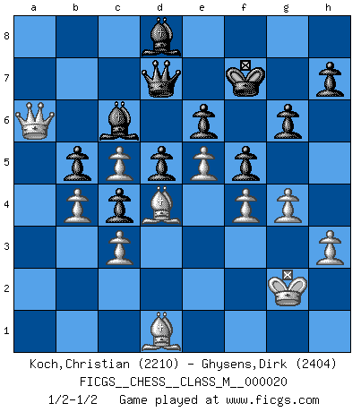 Last move : 1/2-1/2 2008 August 13 21:7:3 [Event "FICGS__CHESS__CLASS_M__000020"] [Site "FICGS"] [Date "2008.05.29"] [Round "1"] [White "Koch,Christian"] [Black "Ghysens,Dirk"] [Result "1/2-1/2"] [WhiteElo "2210"] [BlackElo "2404"] 1.e4 e6 2.d4 d5 3.Nc3 Nf6 4.e5 Nfd7 5.f4 c5 6.Nf3 Nc6 7.Be3 Qb6 8.Na4 Qa5+ 9.c3 c4 10.b4 Qc7 11.Be2 Be7 12.O-O O-O 13.Qe1 b5 14.Nc5 a5 15.a3 Rb8 16.Bd2 axb4 17.axb4 Nxc5 18.dxc5 Bb7 19.Be3 Ra8 20.Qd2 Rfb8 21.Rfb1 Bc8 22.Qc1 f5 23.Rxa8 Rxa8 24.Ra1 Qb8 25.g3 Kf7 26.Qb1 Bb7 27.Bd1 Rxa1 28.Qxa1 Qc7 29.Nd4 Qd7 30.h3 Nxd4 31.Bxd4 Bc6 32.Kg2 g6 33.g4 Bd8 34.Qa6 1/2-1/2 French : Steinitz, Boleslavsky variation Kingside Castling by player White (move 12) Kingside Castling by player Black (move 12) This chess game ended in a draw. Follow this game move after move (download)All my games are real. (Bobby Fischer) Heutzutage gewinnt im Turnier nicht derjenige Spieler, der weitreichende Pläne entwirft, sondern einfach jener, der Zug um Zug kämpft. (David Bronstein) Fischer es una tragedia del Ajedrez Americano a la par con Morphy y Pillsbury. (Mig Greengard) J'ai toujours senti une vague pitié pour l'homme qui ne connaît rien aux échecs, tout comme j'en aurais pour un homme ignorant de l'amour. Les Echecs, comme la musique ou comme l'amour, ont le pouvoir de rendre heureux. (Siegbert Tarrasch) Every man's memory is his private literature. (Aldous Huxley)