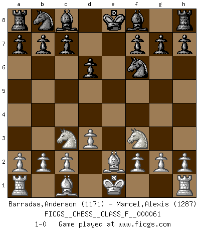 Last move : 1-0 2008 July 27 4:26:20 [Event "FICGS__CHESS__CLASS_F__000061"] [Site "FICGS"] [Date "2008.05.29"] [Round "1"] [White "Barradas,Anderson"] [Black "Marcel,Alexis"] [Result "1-0"] [WhiteElo "1171"] [BlackElo "1287"] 1.e4 e5 2.Nf3 Nf6 3.Nxe5 d6 4.Nf3 Nxe4 5.Qe2 Qe7 6.d3 Nf6 7.Nc3 Qxe2+ 8.Bxe2 1-0 This chess game has been lost on time (started : 2008.05.29 15:45:42) Petrov : Cozio (Lasker) attack Player White won this chess game. Follow this game move after move (download)To avoid losing a piece, many a person has lost the game. (Savielly Tartakover) Später, ... hatte ich zunehmend Erfolg in entscheidenden Partien. Vielleicht weil ich eine einfache Wahrheit erkannte: nicht nur ich hatte Angst, auch mein Gegner. (Mikhail Nekhemyevich Tal) El jugador táctico sabe que hacer cuando hay algo que hacer; mientras que el estratega sabe que hacer cuando no hay nada que hacer. (Gerald Abrahams) Il n'y a plus de joueurs du niveau de Jacob Murray dont la seule quête est le beau jeu, le plaisir de voir les pièces construire quelque chose. Sur 10 idées à la minute, 9 seront sans intérêt, la dernière s'avèrera géniale. (Christian Bauer) Any activity becomes creative when the doer cares about doing it right or doing it better. (John Updike)